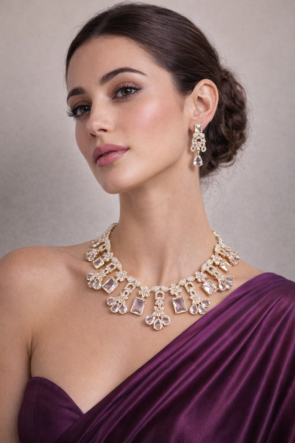 Discover the epitome of elegance with this stunning AD necklace, a masterpiece that radiates luxury and sophistication. The necklace and matching earrings are displayed against a rich maroon velvet backdrop, which highlights the intricate design and sparkling allure of the piece. The shimmering stones meticulously placed in a symmetrical pattern captivate the eye, making this AD necklace a statement of timeless beauty. Crafted with precision, this AD necklace features a series of rectangular and teardrop stones that dangle gracefully, each encased in a delicate setting that reflects exquisite craftsmanship. The gleaming finish of the stones and metal is evident, showcasing the meticulous attention to detail and high-quality materials used. The elegant symmetry and design elements make this piece not just jewellery, but a work of art. Perfect for special occasions such as weddings, anniversaries, or elegant soirées, this AD necklace is more than an accessory—it's a symbol of grace and sophistication. Ideal for gifting to someone special or adding luxurious elegance to your collection. Experience the allure of this exquisite AD necklace and let it be the highlight of your jewellery ensemble.