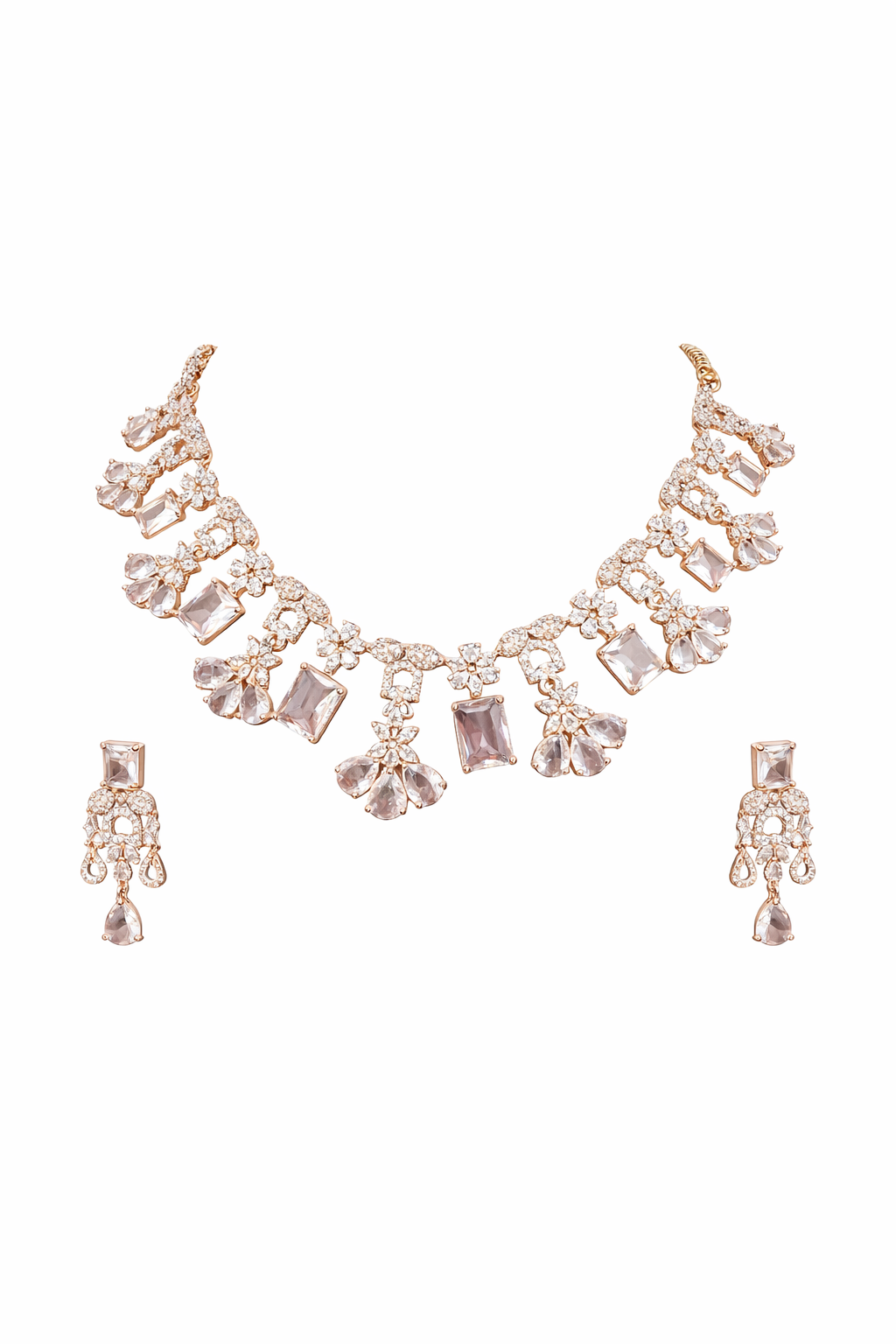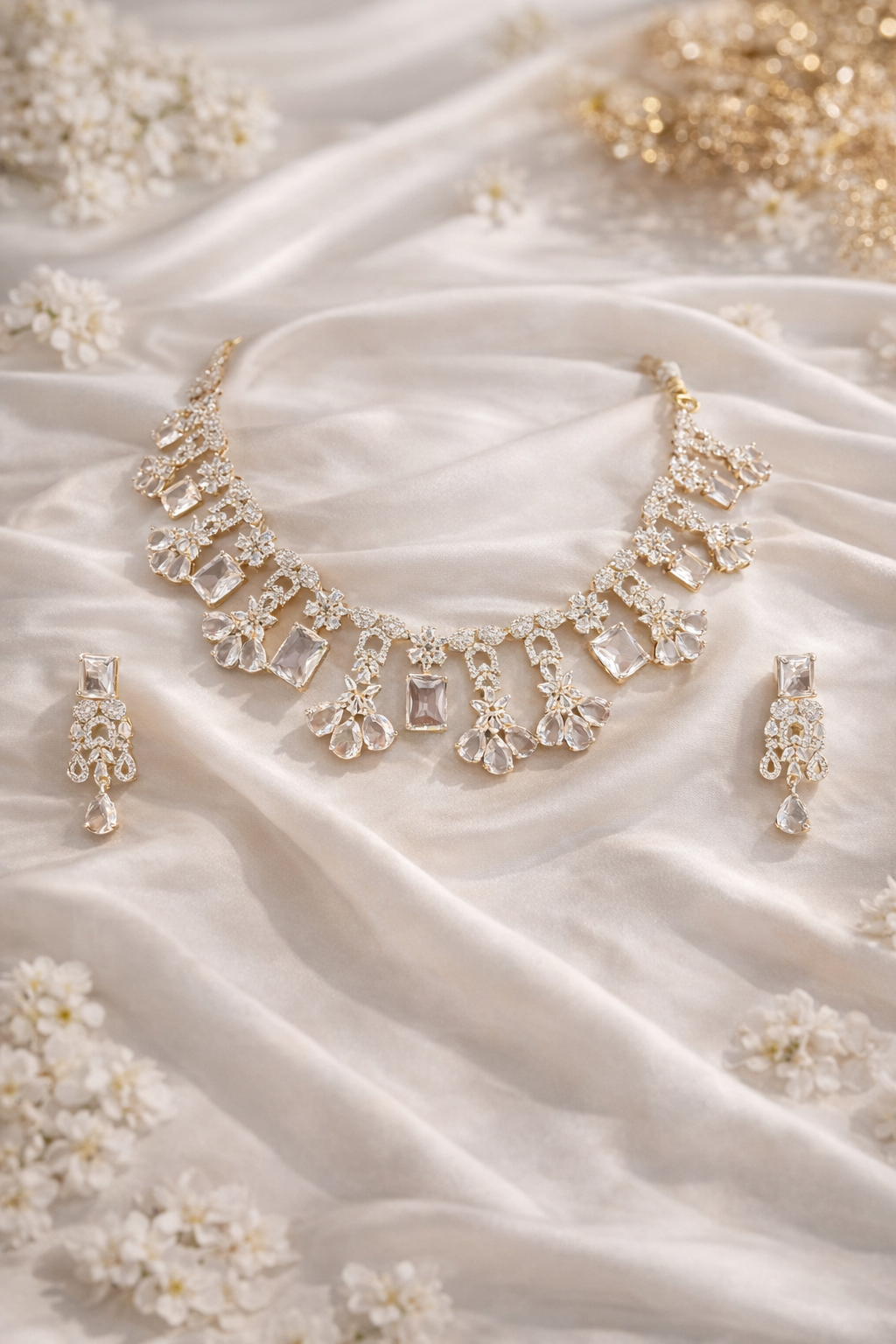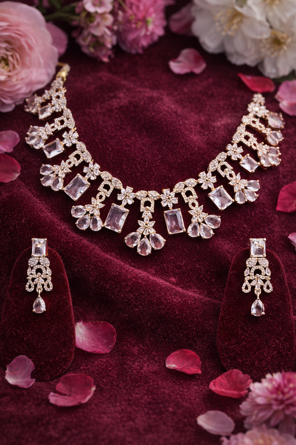Elegant AD Necklace Set with Clear Gemstones and Floral Motifs