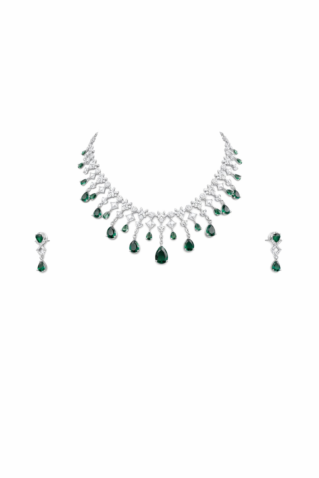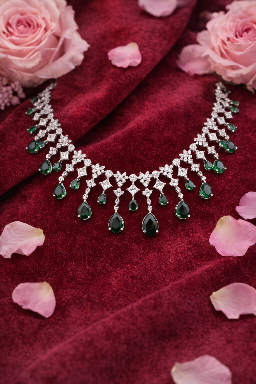 Introducing the exquisite green AD necklace from Savyra, a masterpiece of elegance and sophistication. This necklace exudes opulence with its striking green stones, meticulously arranged against a backdrop of shimmering white accents. The harmonious blend of colors on the rich velvet display creates a captivating visual appeal, making it a statement piece for any discerning jewellery lover. Crafted with precision, this necklace features carefully set droplets of green stones, each framed by brilliant white stones that enhance their allure. The intricate lattice design showcases the expert craftsmanship behind this piece, highlighting the elegance and attention to detail synonymous with our premium collection. Its smooth finish and luxurious texture promise not just beauty, but comfort in its wear. Perfect for grand celebrations or intimate gatherings, this green AD necklace is a versatile accessory that complements both traditional and contemporary outfits. It also makes a memorable gift for loved ones, offering a touch of luxury to any special occasion. Elevate your jewellery collection with this timeless piece from Savyra.