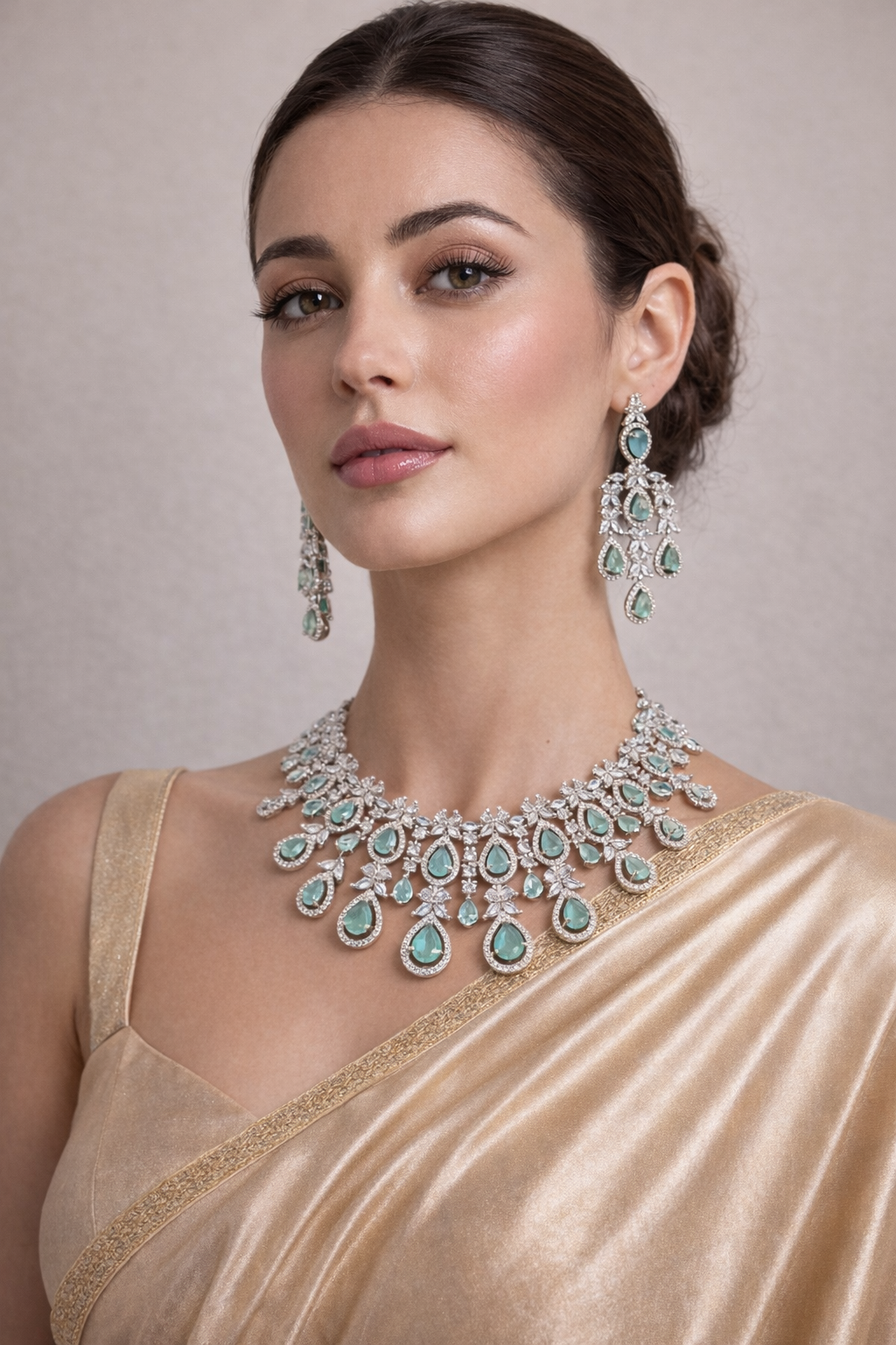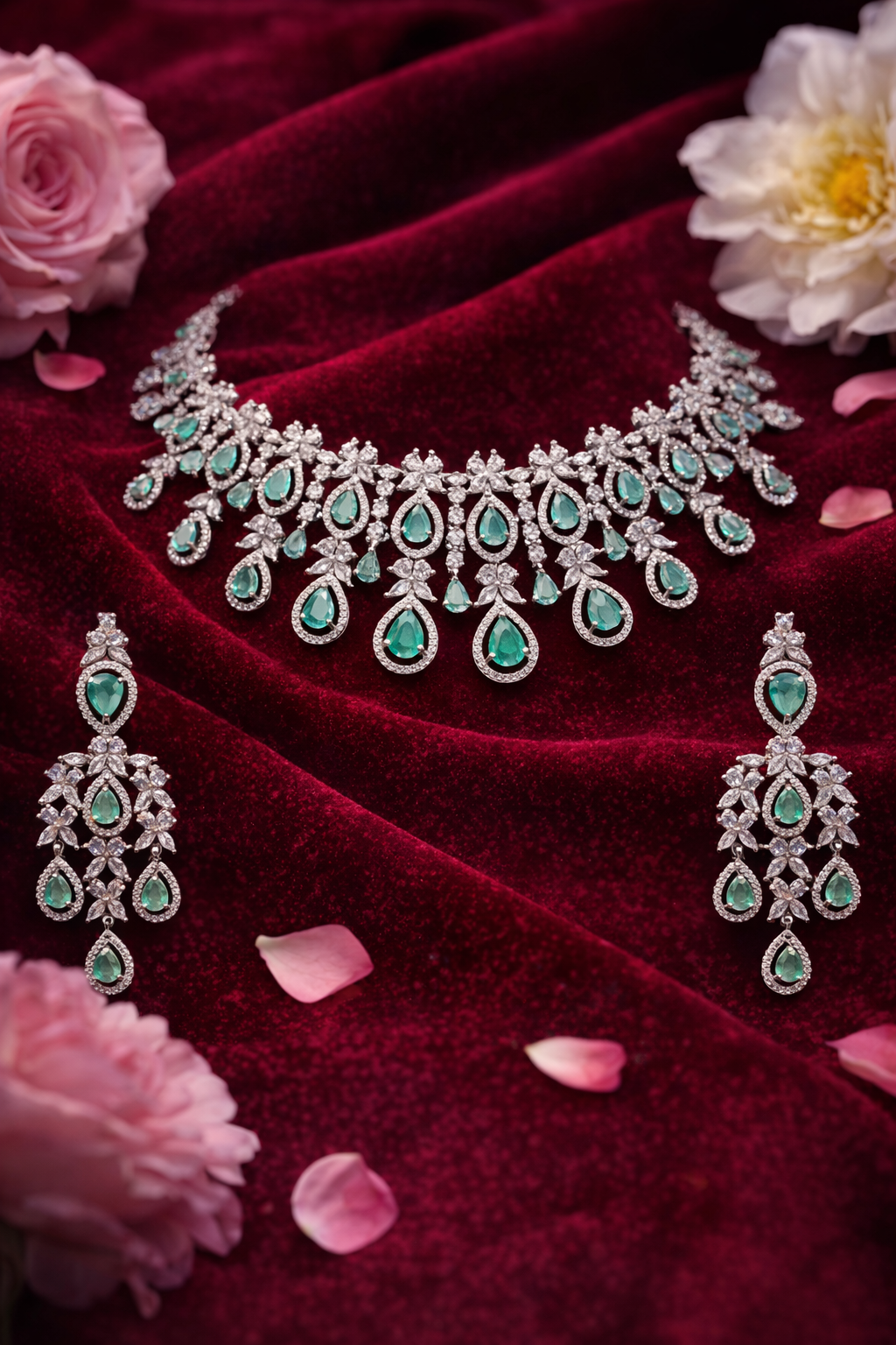 Elevate your elegance with this stunning green stone AD necklace, a masterpiece of sophisticated design and timeless appeal. At first glance, the necklace commands attention with its striking arrangement of lustrous green stones set against a backdrop of sparkling accents. The necklace's intricate pattern cascades beautifully, creating an appealing contrast on a rich burgundy display that highlights its premium allure. Complemented by matching earrings, this set exudes a sense of regal charm. Crafted meticulously, this green stone AD necklace showcases impeccable attention to detail. Each green stone gleams with a lustrous finish, framed by a series of exquisite simulated diamonds that reflect a dazzling brilliance. The craftsmanship ensures a flawless texture and finish, celebrating the art of jewellery making with each intricately placed stone. Designed for those who seek elegance and luxury, the necklace and earrings create a harmonious blend of traditional and contemporary aesthetics. Perfect for grand occasions or as a thoughtful gift for someone special, this green stone AD necklace signifies elegance and sophistication. Whether it's a wedding, gala, or an elegant evening out, this piece will enhance your ensemble, leaving an unforgettable impression. Step into the spotlight with distinction—add this exquisite necklace to your collection today.