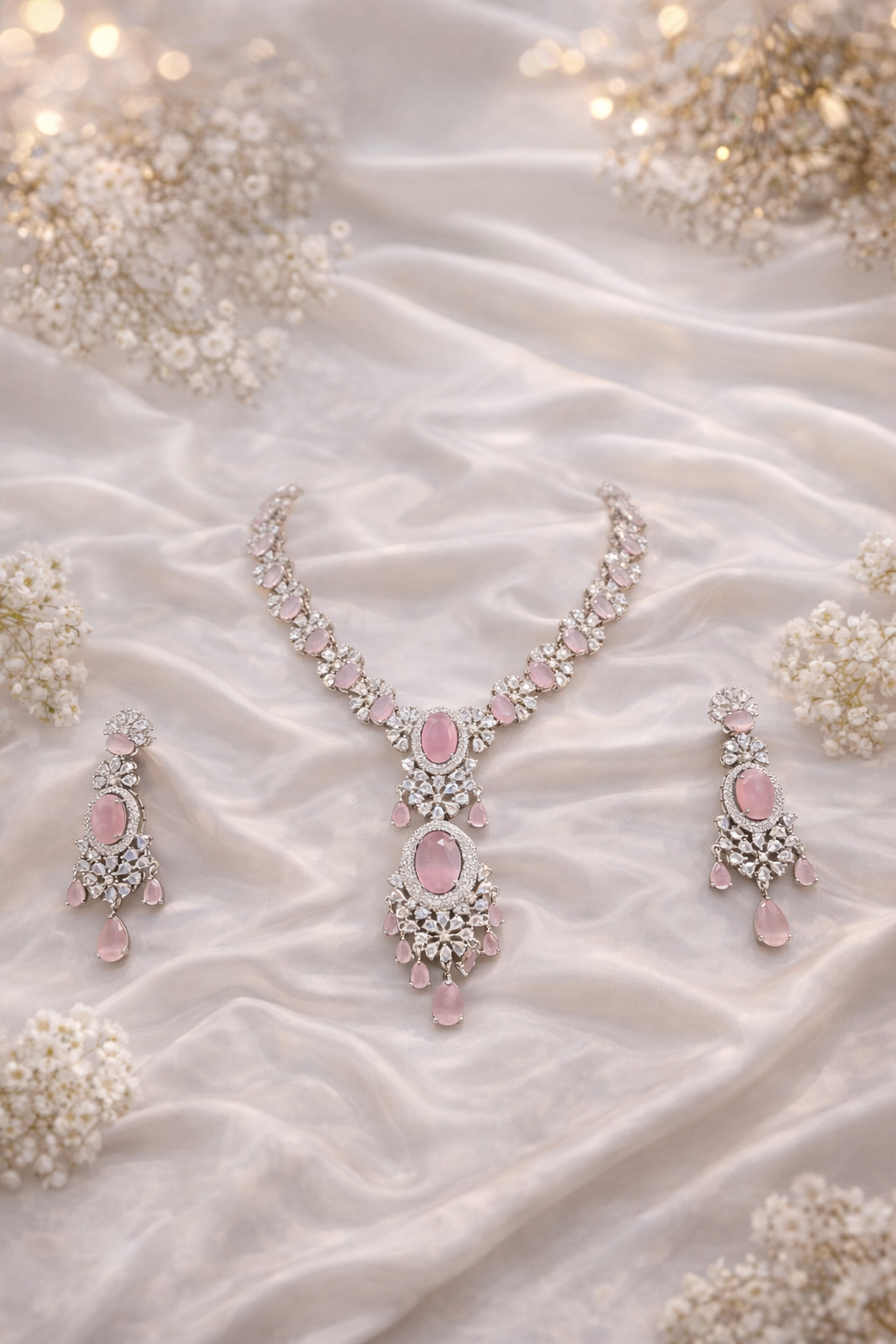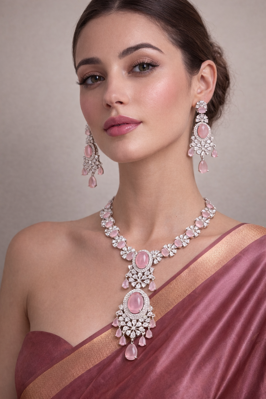 Introducing our stunning AD necklace set, a perfect blend of elegance and sophistication. This masterpiece showcases a mesmerizing arrangement of shimmering details set against a rich maroon velvet backdrop. The pink stone centerpiece is surrounded by intricate floral patterns, capturing the essence of timeless beauty and grace. Crafted with precision, this AD necklace set features exquisite craftsmanship. The lustrous silver elements beautifully complement the blush hues of the pink stones, offering a harmonious balance. The intricate design and sparkling accents reflect exceptional attention to detail, ensuring a captivating appearance. Ideal for grand celebrations or intimate gatherings, this AD necklace set adds a touch of luxury to any occasion. It also makes a thoughtful gift for loved ones cherishing elegance and style. Explore our collection today and elevate your jewellery repertoire with this exquisite piece.