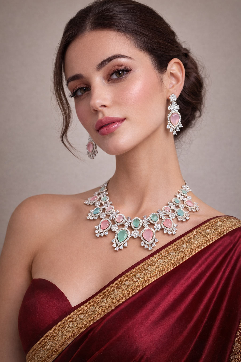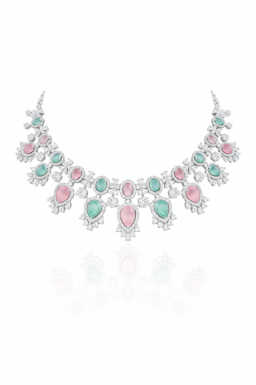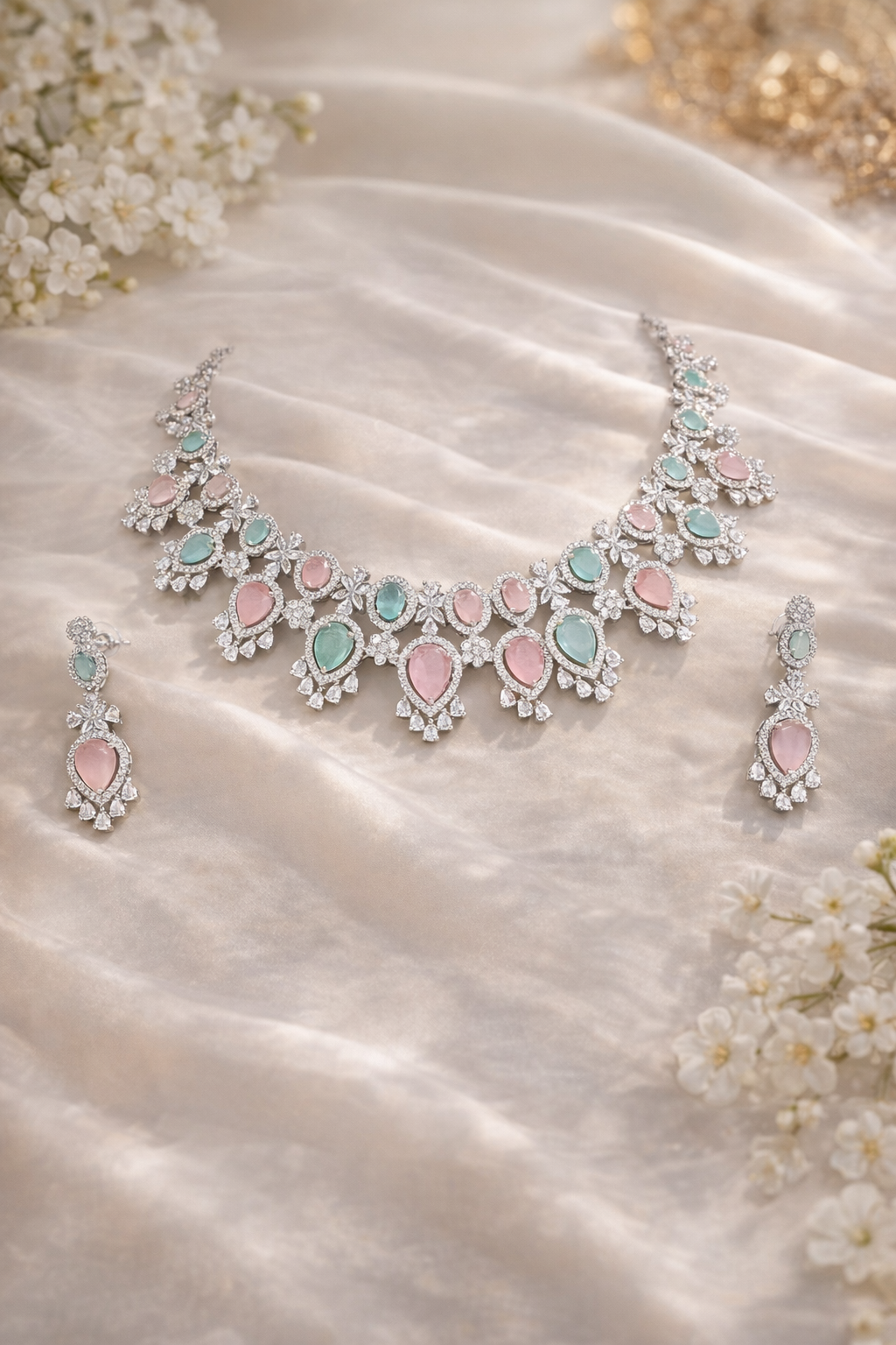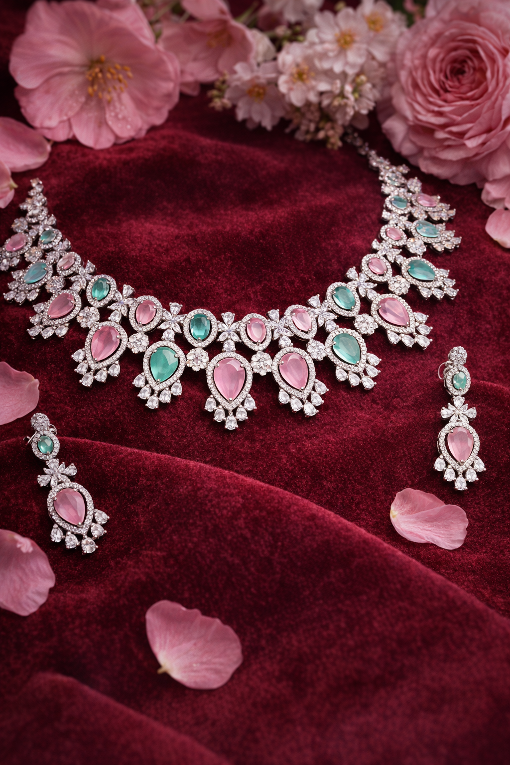 Introducing our exquisite AD necklace, a statement piece that embodies elegance and charm. This stunning necklace showcases a harmonious blend of pastel hues, with alternating pink and teal stones that capture the light beautifully. Set against a rich burgundy display, the intricate design radiates sophistication, making it a true work of art. Crafted with precision, each stone is surrounded by a dazzling array of clear, shimmering accents, enhancing the necklace's allure. The stones are expertly set in intricate patterns that highlight the craftsmanship and attention to detail. The necklace, accompanied by matching earrings, exudes a luxurious finish, underscoring the premium quality synonymous with Savyra's AD necklaces. Perfect for elevating any ensemble, this AD necklace is an ideal choice for weddings, festive occasions, or as a luxurious gift for someone special. Indulge in the elegance and timeless beauty of this piece, and let it be the crowning jewel of your jewelry collection.