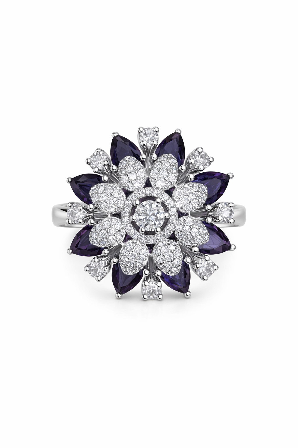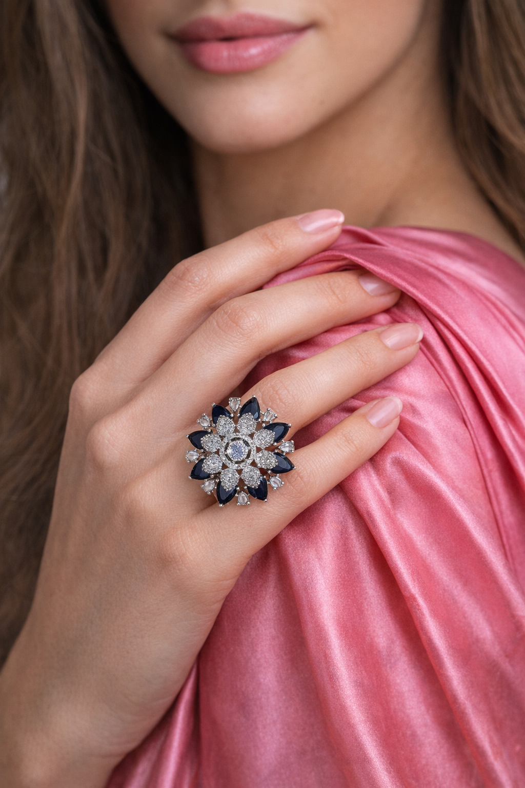 Embrace timeless elegance with the Elegant Floral Diamond Studded AD Ring from Savyra. This exquisite floral diamond ring is designed to captivate with its intricate flower motif, radiating sophistication and charm. Nestled against a backdrop of soft pastel fabrics, the ring's shimmering brilliance stands out, making it a must-have accessory for those who appreciate refined beauty. Crafted with meticulous attention to detail, this floral diamond ring features dazzling AD stones set in a breathtaking floral pattern. The central bloom is accentuated with glistening crystals, while dark petal-like accents provide a stunning contrast, enhancing the ring’s allure. Each element is polished to perfection, ensuring a luxurious finish that reflects the light beautifully. Ideal for special occasions or intimate gatherings, this ring is versatile enough to elevate any ensemble. It also makes a thoughtful gift for loved ones who cherish fine craftsmanship and elegant jewelry. Discover the perfect blend of artistry and elegance with Savyra's floral diamond ring today.