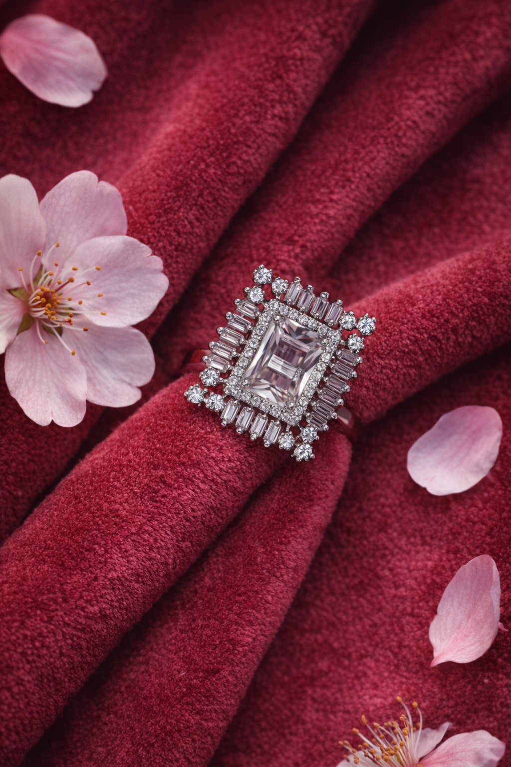 Introducing our exquisite rectangular AD ring, a statement piece that embodies elegance and luxury. The gleaming centerpiece, a perfectly cut rectangular stone, is encircled by a dazzling array of smaller stones, creating a sophisticated halo effect. Resting on a lush fabric of delicate pastels, the ring's brilliance contrasts beautifully, making it a captivating vision of opulence. Crafted with precision, this rectangular AD ring showcases exceptional artistry. The intricate setting, featuring a harmonious arrangement of baguette and round stones, reflects meticulous attention to detail. The high-quality finish adds an extra layer of sophistication, ensuring the ring sparkles with every movement, enhancing its allure. Perfect for grand celebrations, intimate gatherings, or as a cherished gift, this rectangular AD ring is a timeless symbol of style and grace. Elevate your ensemble and make unforgettable memories by adding this masterpiece to your collection. Experience the allure of luxury today.