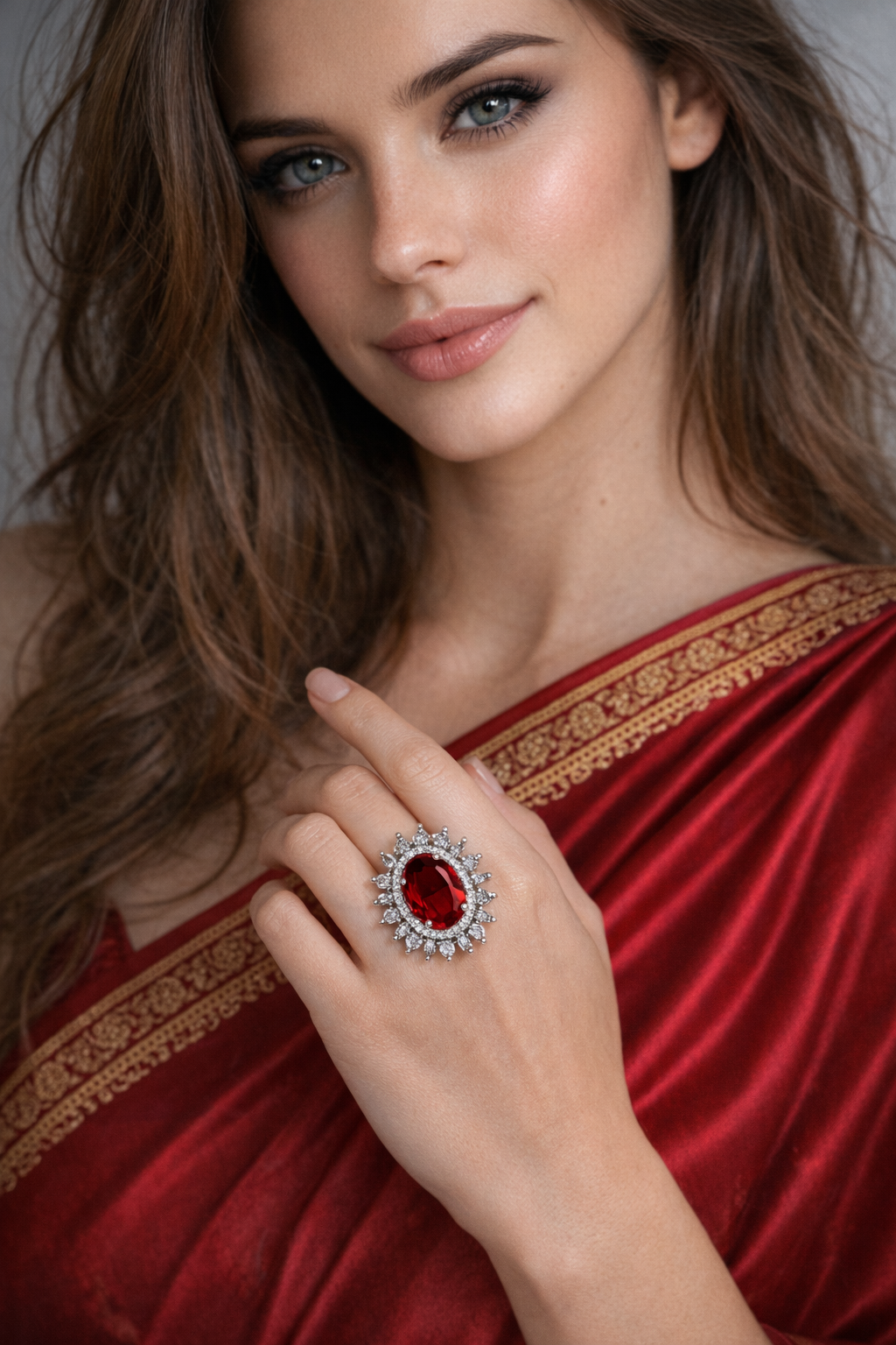 Introducing our exquisite ruby red AD ring, a stunning piece from Savyra's premium collection. Set against a backdrop of soft pink, ivory, and yellow fabrics, this ring radiates elegance and sophistication. The vivid red hue of the central stone captivates instantly, drawing the eye with its rich, luxurious allure. Perfectly poised for those who appreciate fine craftsmanship and timeless beauty. This ruby red AD ring boasts meticulous attention to detail. The central stone, in a deep crimson shade, is magnificently framed by a halo of sparkling clear stones, creating a breathtaking sunburst effect. The intricate setting highlights the brilliance of every stone, showcasing a flawless balance of color and clarity. Crafted with precision, this piece personifies elegance and regal charm. Ideal for any occasion, from glamorous soirées to intimate gatherings, this ruby red AD ring is a testament to refined taste. Whether as a personal indulgence or a luxurious gift, it promises to leave a lasting impression. Elevate your jewelry collection with this enchanting ring from Savyra today.