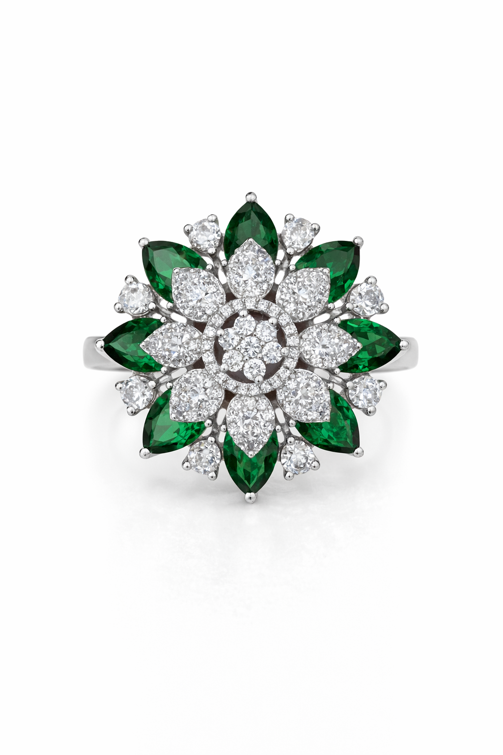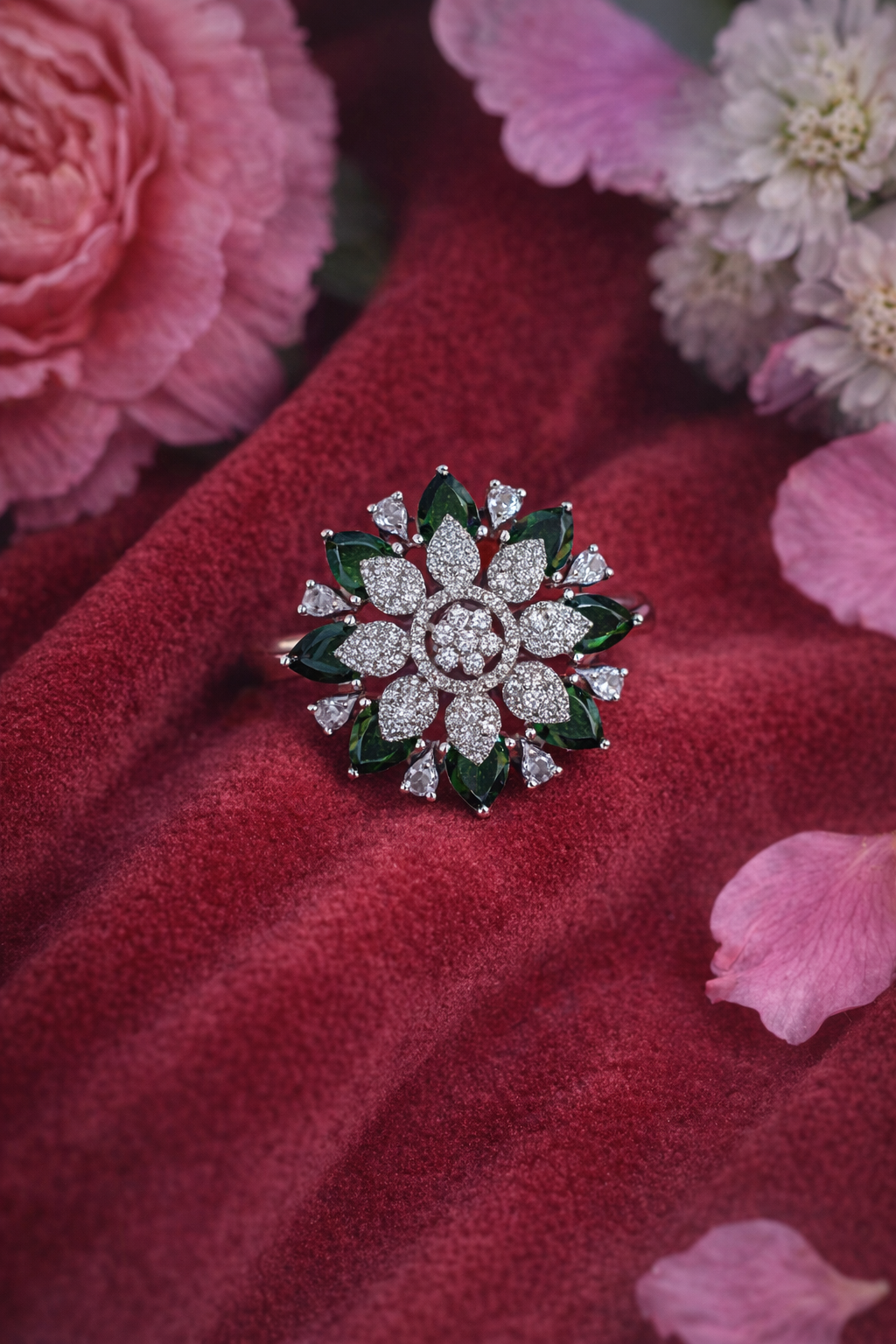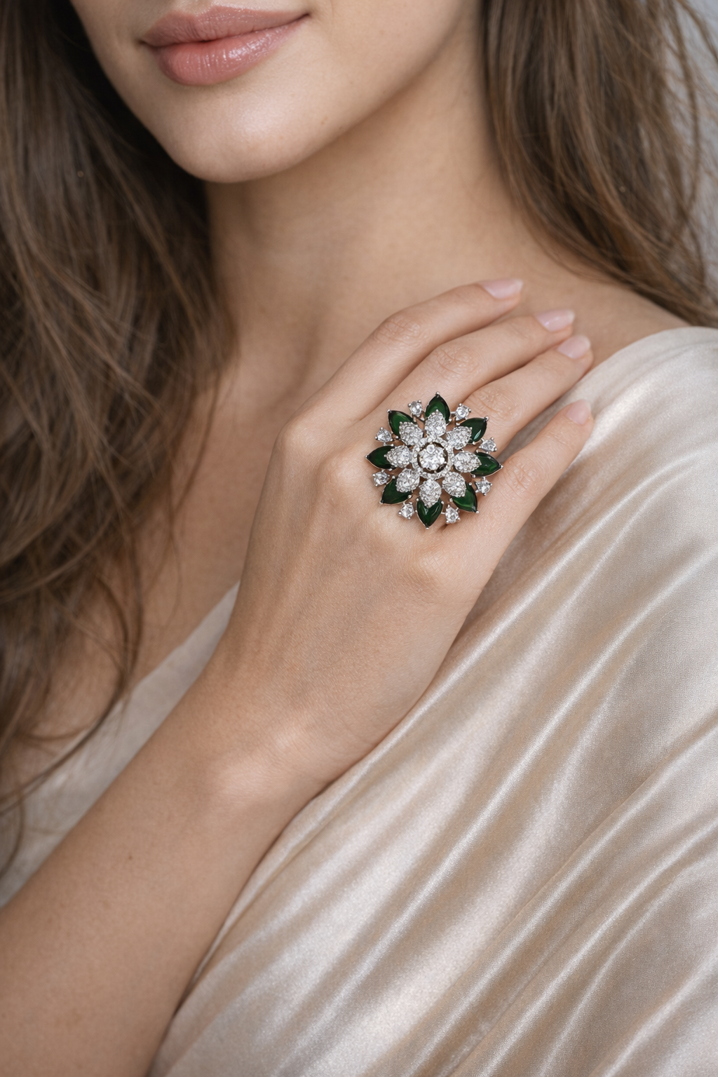 Discover elegance with our exquisite floral AD ring, a masterpiece that captivates with its intricate beauty. Set against pastel hues of plush fabric, this ring radiates sophistication, effortlessly drawing attention with its alluring design. Its shimmering brilliance is complemented by deep green accents, making it a stunning addition to any jewellery collection. This floral AD ring is meticulously crafted, featuring a captivating flower motif adorned with dazzling stones. The petals, outlined by green elements, encircle a central, sparkling gem, creating an exquisite display of artistry. The combination of textures and materials reflects the superior craftsmanship and attention to detail inherent in each piece. Perfect for special occasions, this floral AD ring adds a touch of luxury to any ensemble. Whether it’s a wedding, anniversary, or festive celebration, its timeless elegance makes it an unforgettable gift. Elevate your style with this captivating piece — a must-have for jewellery connoisseurs.