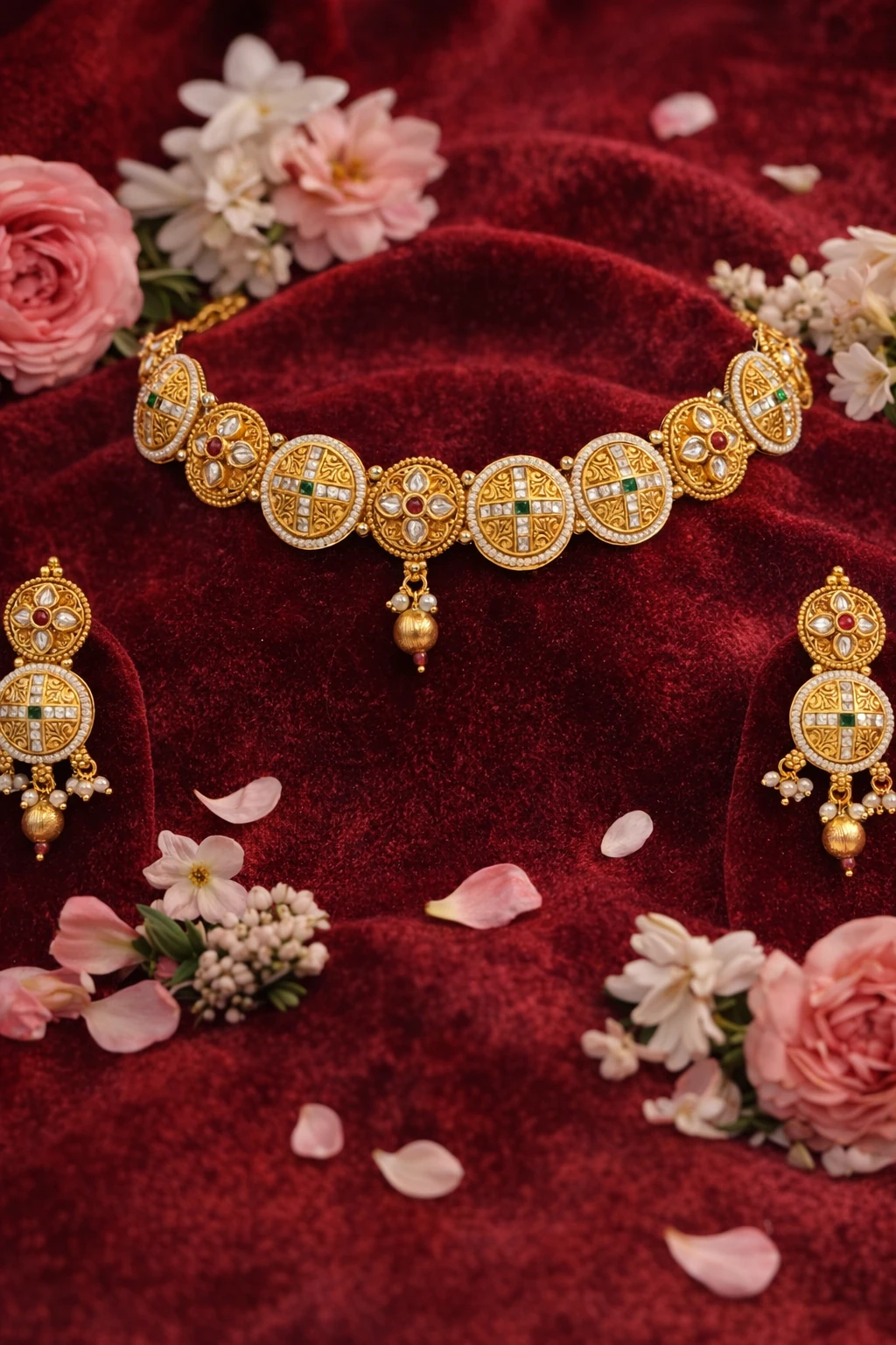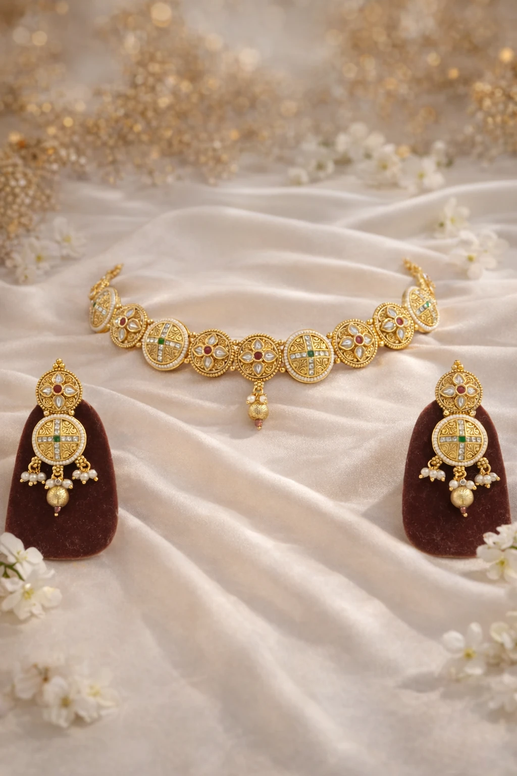 Introducing our exquisite Antique Necklace, a masterpiece from Savyra's collection of antique necklaces. This stunning piece captivates with its intricate craftsmanship and timeless elegance. Set on a deep maroon velvet display, the harmonious blend of gold and sparkling embellishments immediately draws attention to its luxurious design. Crafted with meticulous attention to detail, this antique gold-plated necklace features a series of intricate circular motifs, each adorned with delicate patterns and radiant gemstones. The center of each motif showcases an elegant floral design, while the alternating sections are enhanced with reflective jewels, adding a touch of glamour. The inclusion of pearl-like accents dangling gracefully adds movement and sophistication to the piece. Perfect for grand celebrations or as a cherished gift, this antique gold-plated necklace complements both traditional and contemporary attire. Elevate your collection with this statement accessory. Embrace a touch of vintage charm by adding this stunning piece to your jewelry box today.
