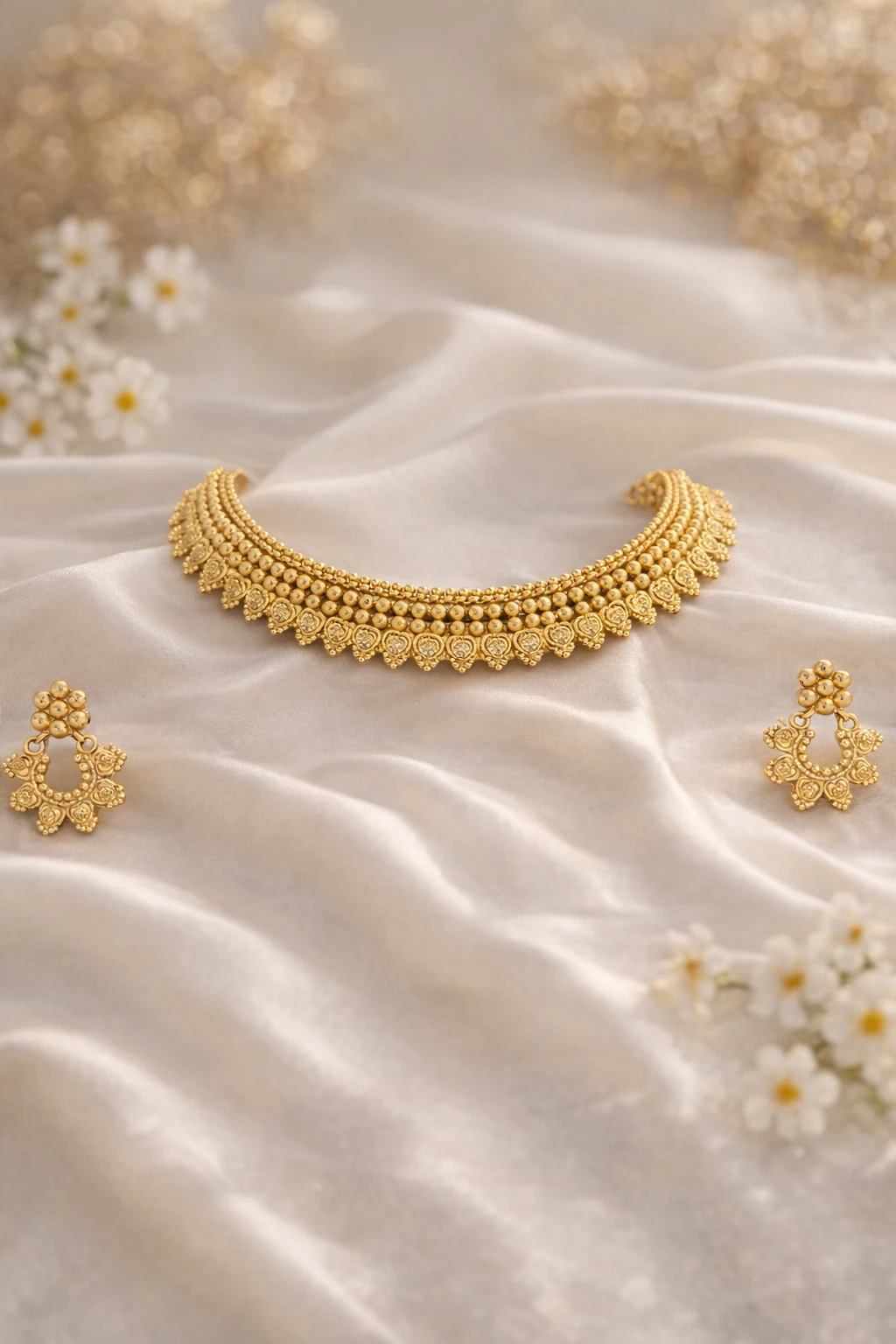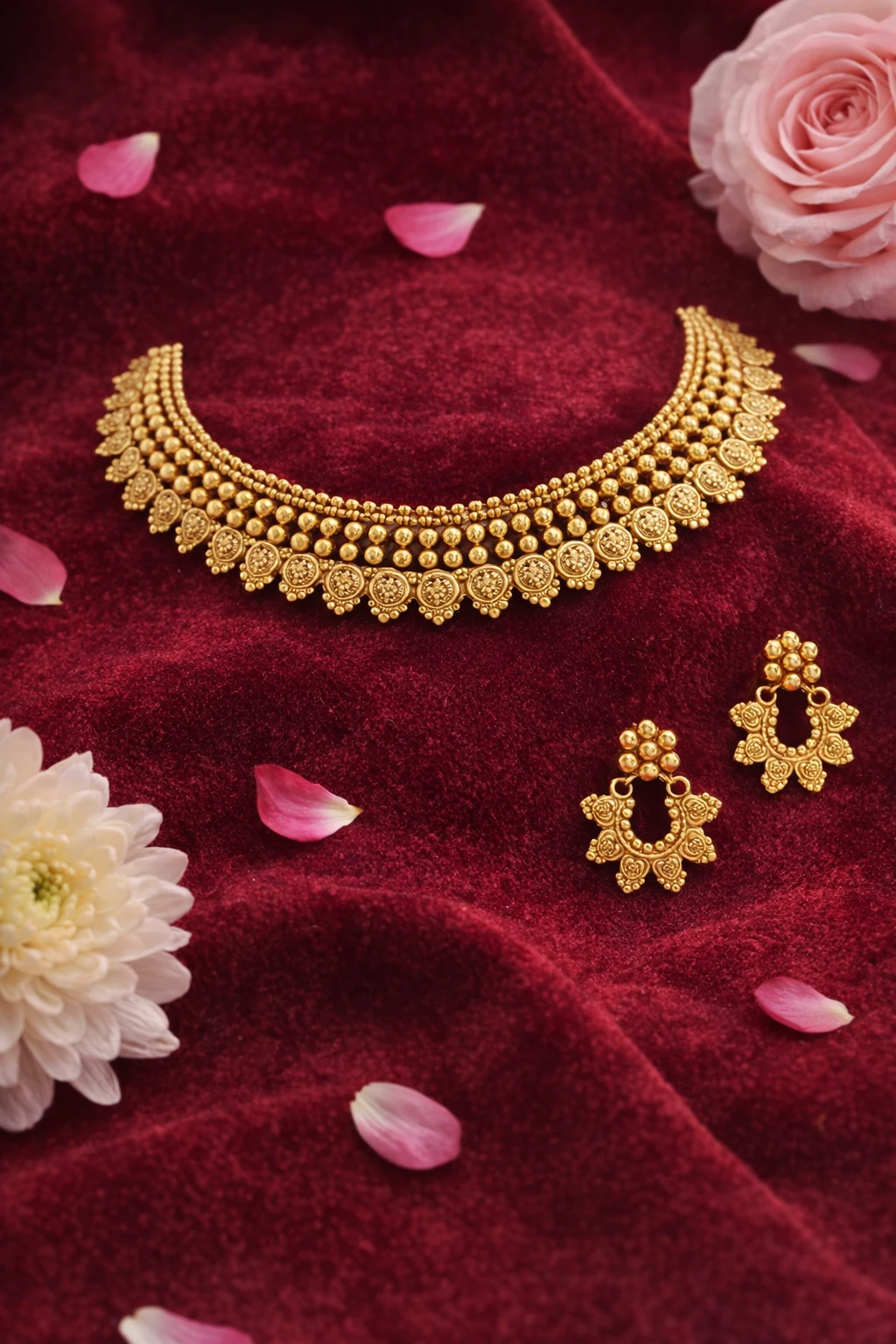 Introducing our exquisite Antique Necklace, a true testament to timeless elegance and sophistication. This antique gold necklace set features an intricate design that captures the eye with its detailed craftsmanship. Resting gracefully on a plush burgundy velvet stand, the necklace is complemented by matching earrings, making it a complete set for those who appreciate classic beauty. Meticulously crafted with a golden hue, this set showcases an array of delicate floral motifs, each bead and embellishment adding to its exquisite texture and charm. The necklace's intricate patterns are a hallmark of expert artisanship, reflecting the rich heritage of traditional jewelry design. The accompanying earrings mirror the necklace’s ornate style, ensuring a harmonious and polished look. Perfect for grand celebrations or intimate gatherings, this antique gold necklace set makes a stunning choice for those special occasions. Its elegant design also makes it an ideal gift for a loved one, promising to leave a lasting impression. Elevate your accessory collection with this masterpiece today.