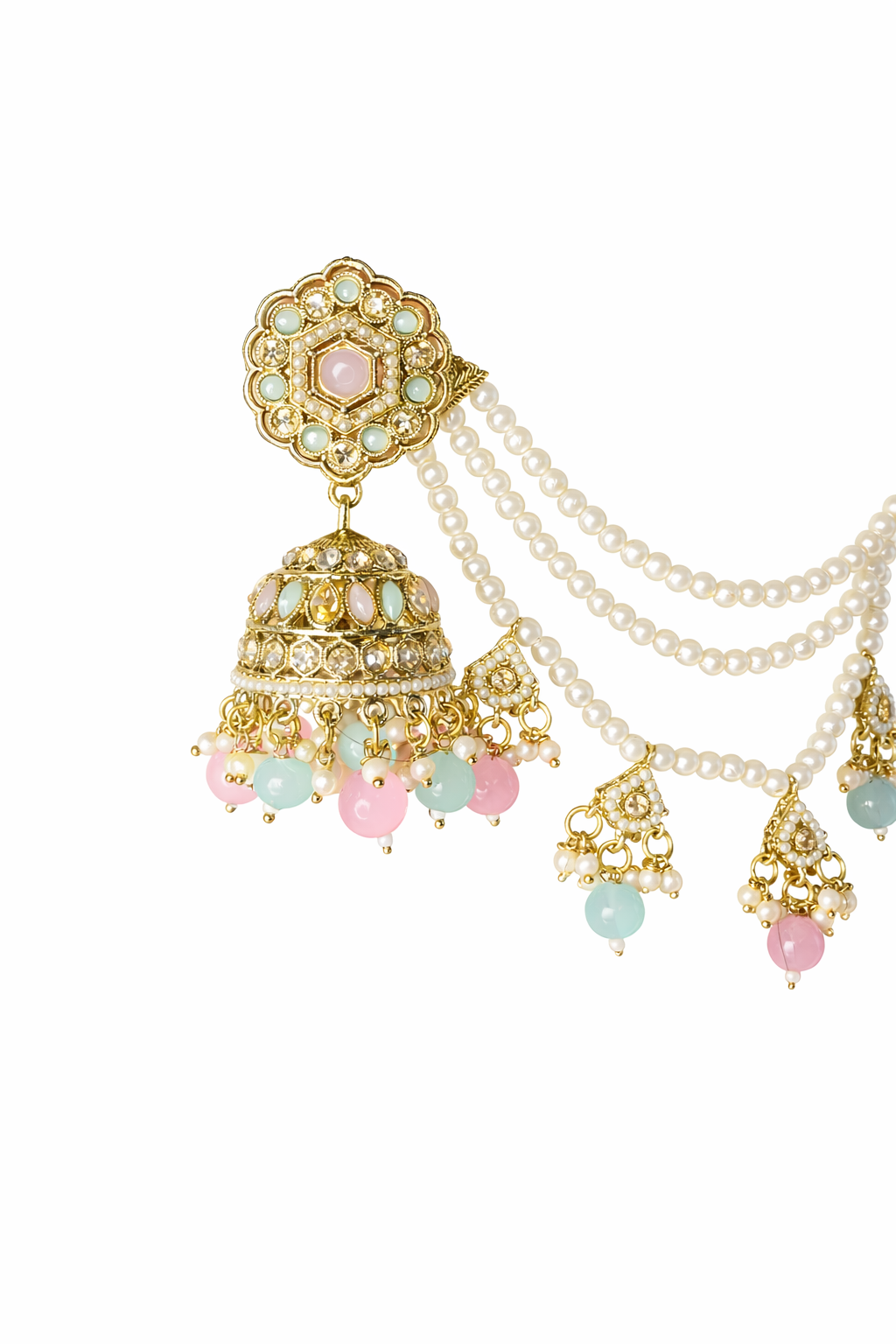 Introducing the Bahubali Earrings, where elegance meets grandeur. These stunning earrings are designed to make a statement, captivating with their exquisite blend of traditional and contemporary styles. The intricate detailing and luxurious pearls cascading down create a mesmerizing visual effect, perfectly complementing the pastel hues of blue and pink beads. Crafted with precision, the Bahubali earrings showcase masterful artistry. The gold-toned base is adorned with ornate engravings and embedded with subtle pearls that add a touch of sophistication. The dazzling gemstones, meticulously placed, enhance the opulence of this piece, making it a must-have for any jewelry collection. The harmonious design of pearls and gems makes these earrings a true testament to fine craftsmanship. Perfect for grand occasions, the Bahubali earrings are ideal for weddings, festive celebrations, or any event where you want to shine. These exquisite earrings also make a luxurious gift for a loved one, symbolizing elegance and timeless beauty. Elevate your ensemble and make a lasting impression with the Bahubali earrings.