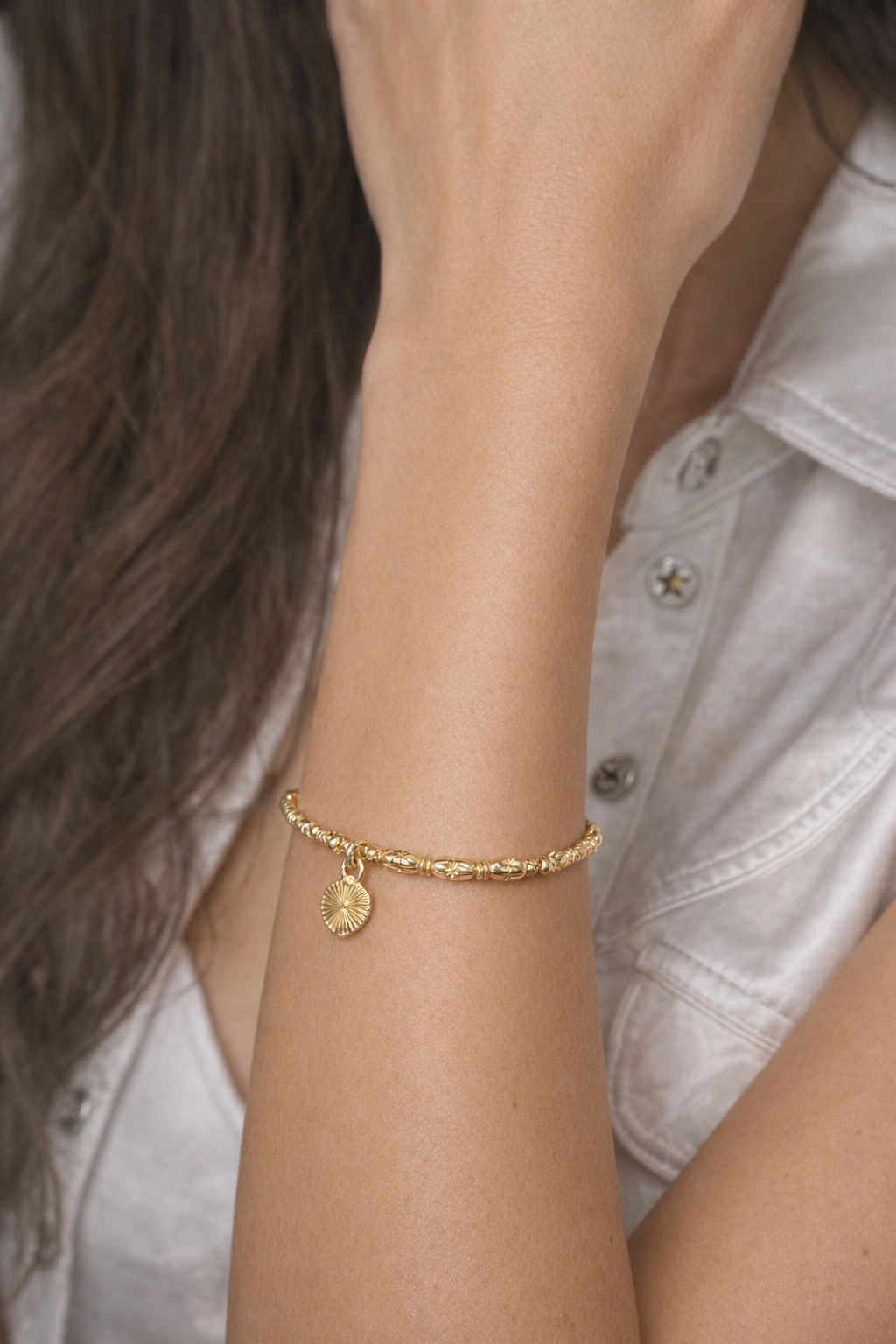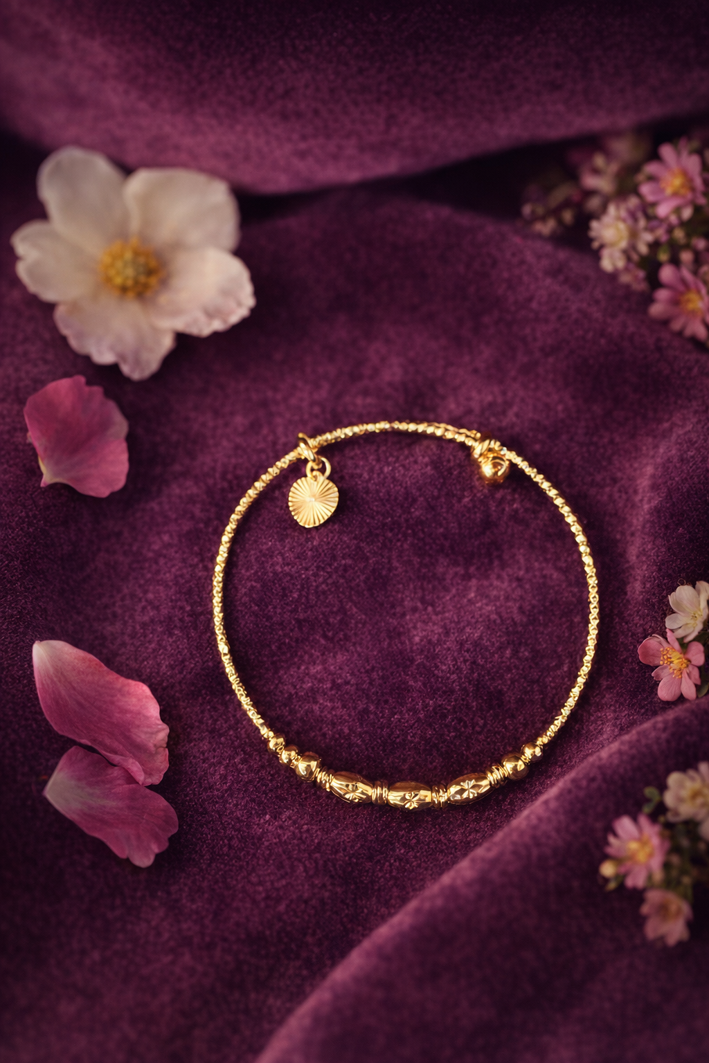 Introducing the exquisite gold charm bracelet by Savyra, where elegance meets artistry. Crafted with precision, this bracelet showcases a lustrous golden hue that captures the light beautifully, accentuated by a delicate charm with intricate detailing. Resting against a rich, textured fabric, the bracelet's shimmer and sophistication are undeniable, making it a standout accessory for any ensemble. This gold charm bracelet is a testament to exceptional craftsmanship. The bracelet features intricate designs along its band, highlighting a keen attention to detail. Each element is carefully crafted to create a seamless blend of tradition and contemporary style. The delicate charm dangles gracefully, adding a touch of personality to this refined piece. Perfect for any occasion, this gold charm bracelet is more than just an accessory—it's an expression of elegance. Whether you're attending a formal event or looking for a meaningful gift, this bracelet is an ideal choice. Elevate your style with Savyra's timeless allure, and let your elegance shine.
