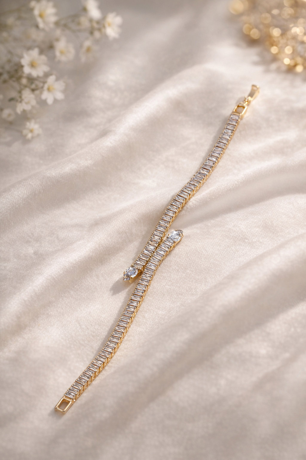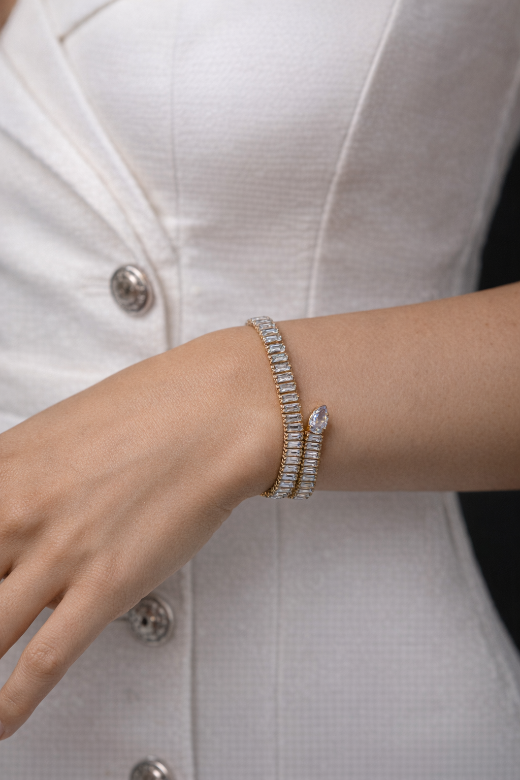 Elevate your style with our exquisite gold snake bracelet, a masterpiece of elegance and sophistication. Adorned with shimmering stones set in a luxurious gold band, this bracelet captures the essence of opulence. The snake-like design is both bold and graceful, making it an eye-catching addition to any ensemble. Crafted with exceptional artistry, each link in the bracelet showcases meticulously arranged crystals, creating a harmonious blend of sparkle and gold. The lifelike snake head features intricate detailing, highlighting the craftsmanship that goes into each piece. Designed to wrap elegantly around the wrist, the bracelet offers a seamless and polished finish. Perfect for special occasions or as a unique gift, this gold snake bracelet embodies timeless style. Whether dressing up for a gala or adding a touch of luxury to everyday wear, it is a symbol of refined taste. Discover the allure and enchantment of this captivating piece and make it yours today.