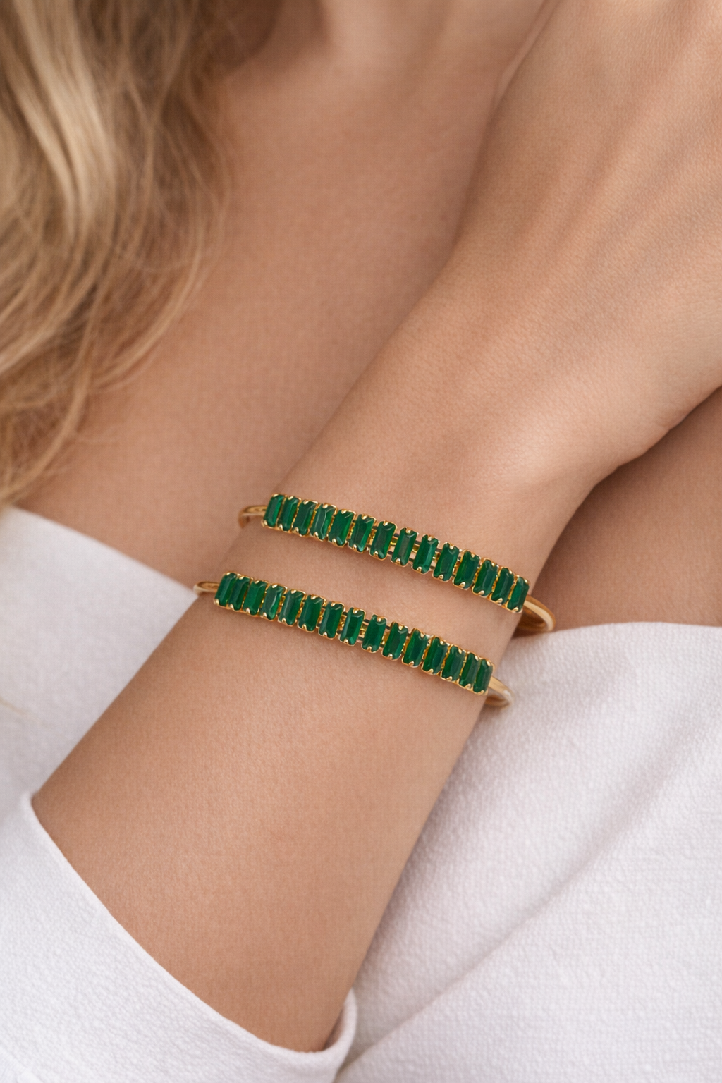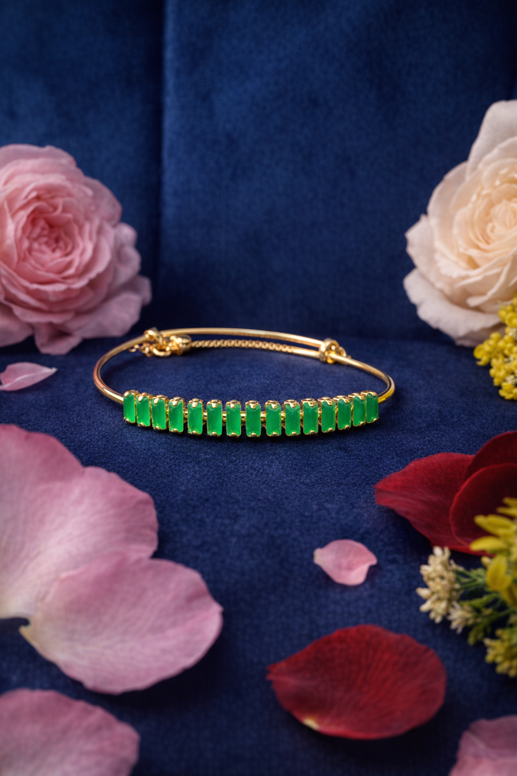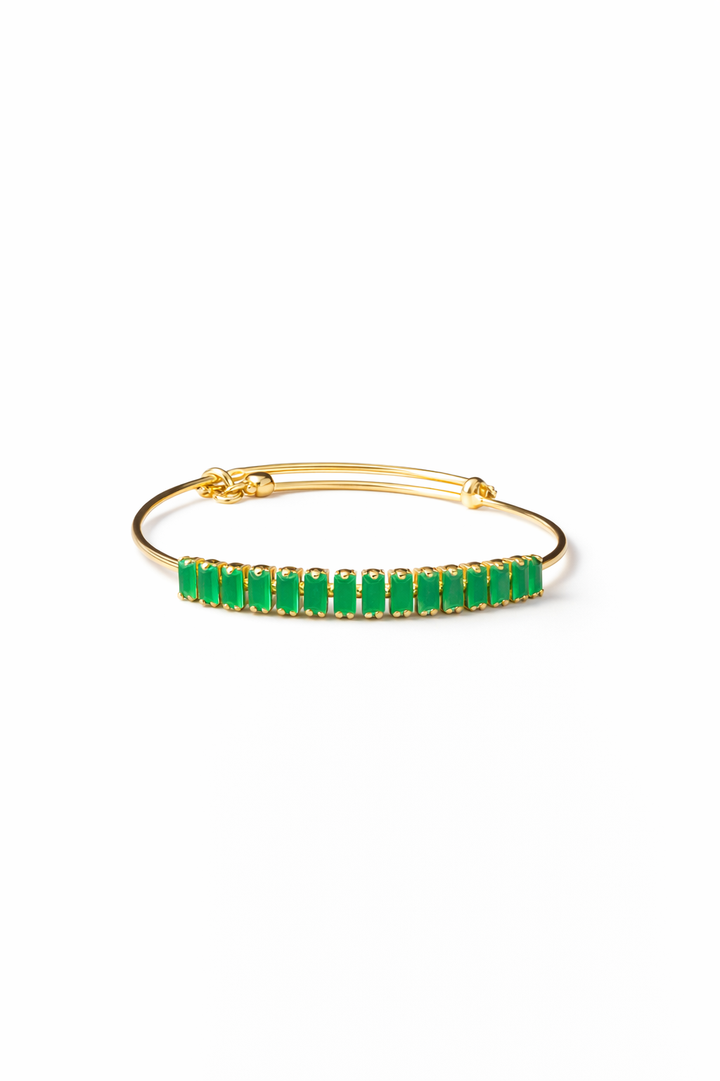 Introducing the exquisite Bracelet Set by Savyra, a stunning embodiment of elegance and sophistication. This green stone gold bracelet commands attention with its vibrant emerald hue, perfectly complemented by a shimmering gold setting. The symmetrical arrangement of green stones along the sleek, gold frame creates a harmonious blend of color and style, making it a standout piece in your accessory collection. Crafted with precision, each green stone is carefully set within a polished gold frame, highlighting Savyra's commitment to top-tier craftsmanship. The design showcases a series of neatly aligned stones, emphasizing the bracelet's luxurious appeal. The smooth finish and intricate detailing reflect the unparalleled artistry involved in creating this elegant piece, ensuring it is both a stunning visual and tactile experience. Ideal for special occasions or as a thoughtful gift, this green stone gold bracelet elevates any ensemble with its alluring charm. Whether celebrating a milestone or enhancing daily elegance, this bracelet set promises to captivate and enchant. Discover timeless sophistication with Savyra and let your style shine.