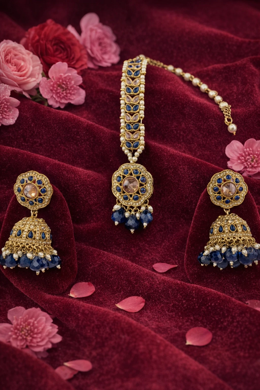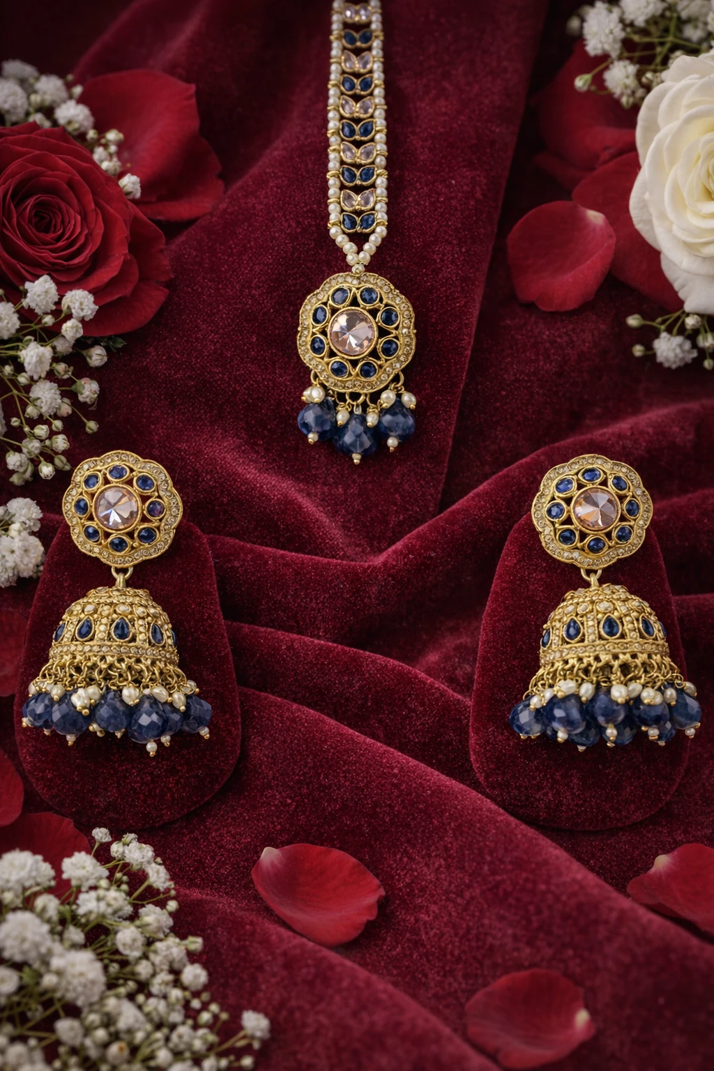 Elevate your elegance with this exquisite set of gold jhumkas with maang tika, presented on a luxurious red velvet display. The striking contrast of deep blue and gold creates a mesmerizing visual appeal, making these pieces a centerpiece for any occasion. The intricate detailing and cascading beads add a touch of regal sophistication. Handcrafted with precision, these gold jhumkas exhibit the fine artistry of skilled craftsmen. The delicate filigree work is adorned with rich blue stones and intricate gold embellishments. The matching maang tika elegantly complements the jhumkas with its harmonious blend of design elements, accentuated by lustrous pearls and teardrop beads. Perfect for weddings, festive celebrations, or as a thoughtful gift for a loved one, these gold jhumkas redefine opulence. Gift this timeless treasure or make it an heirloom piece in your collection. Discover luxury and tradition with our gold jhumkas with maang tika.