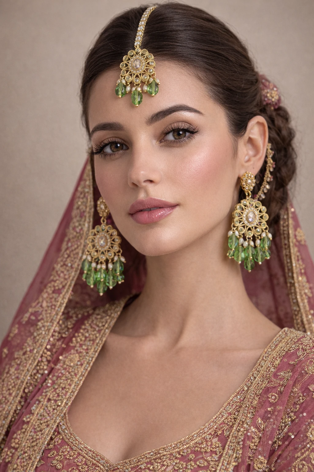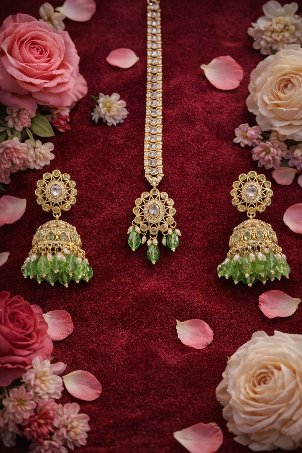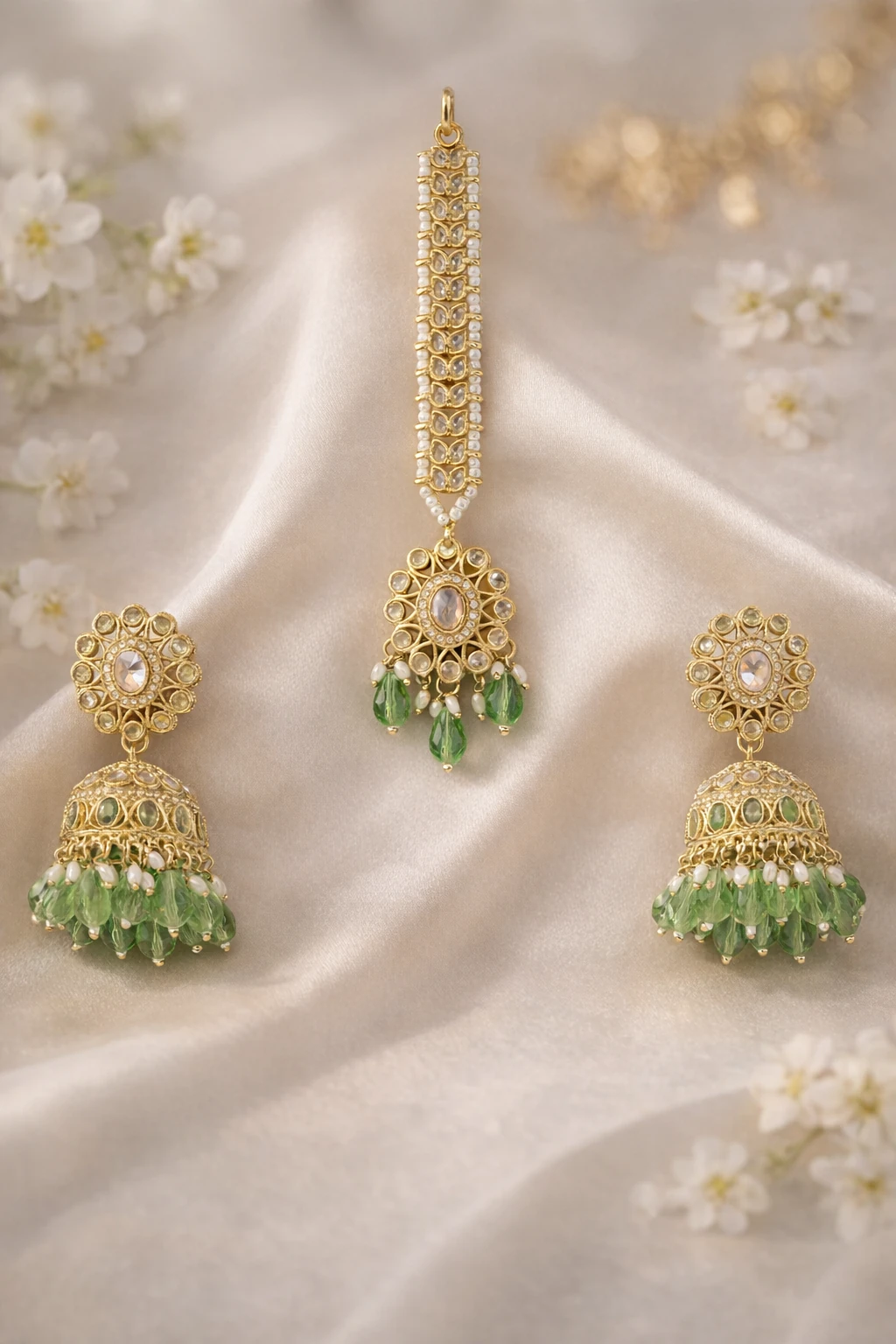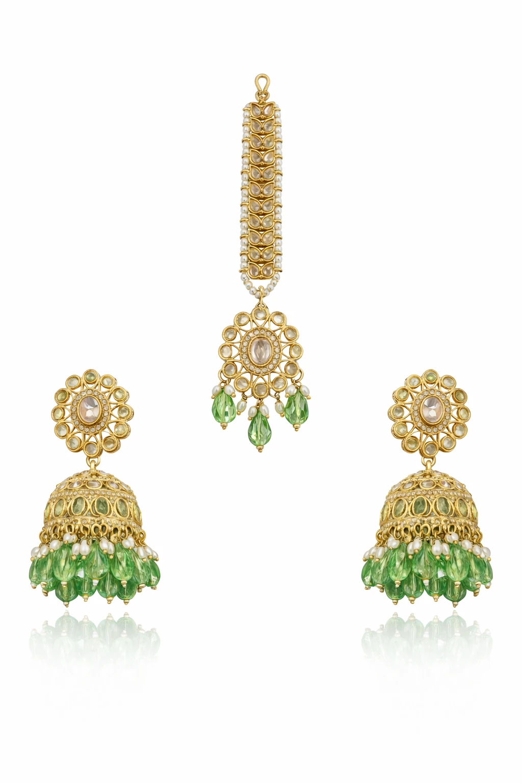 Gold-Plated Jhumka with Maang Tika Set with Green Beads