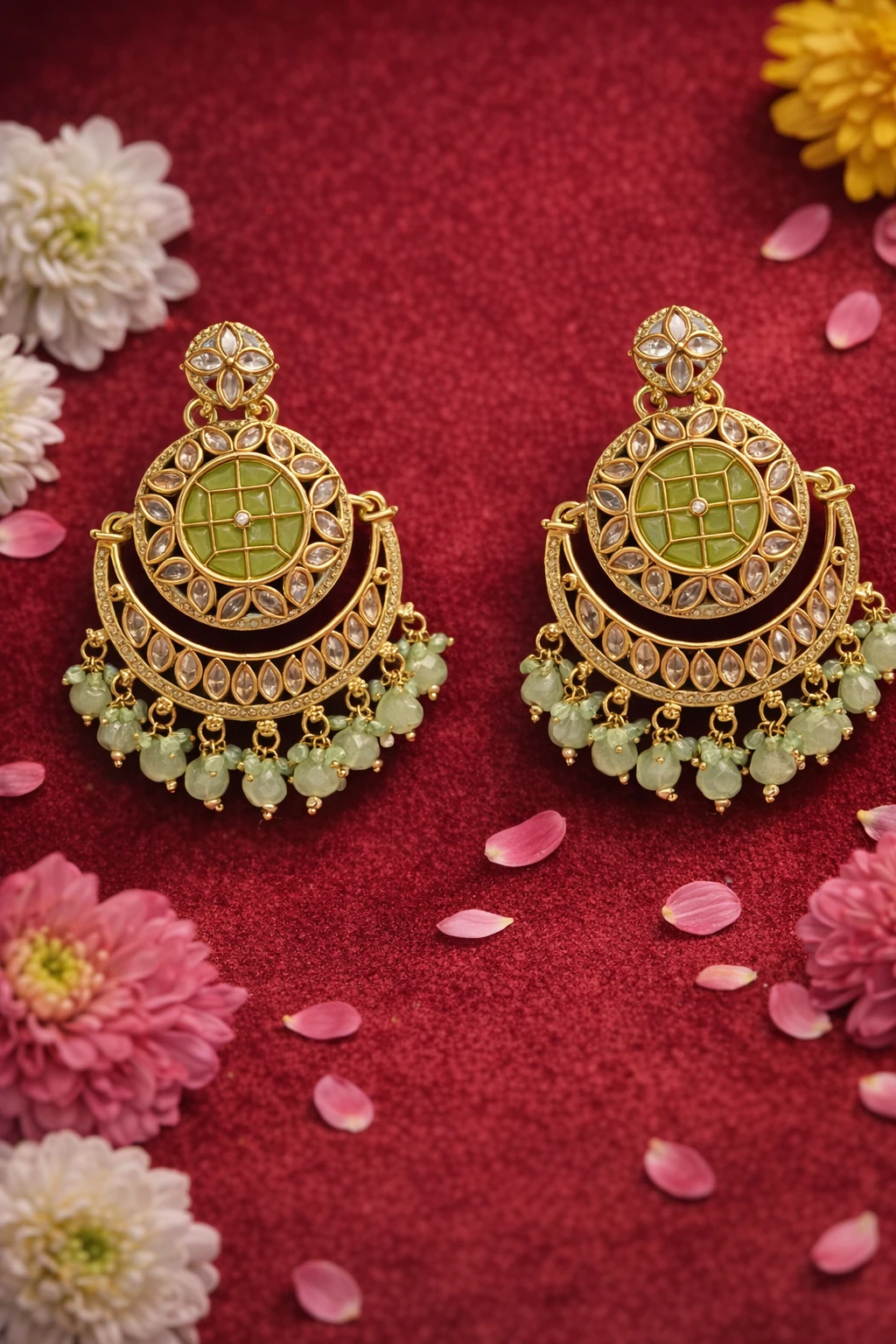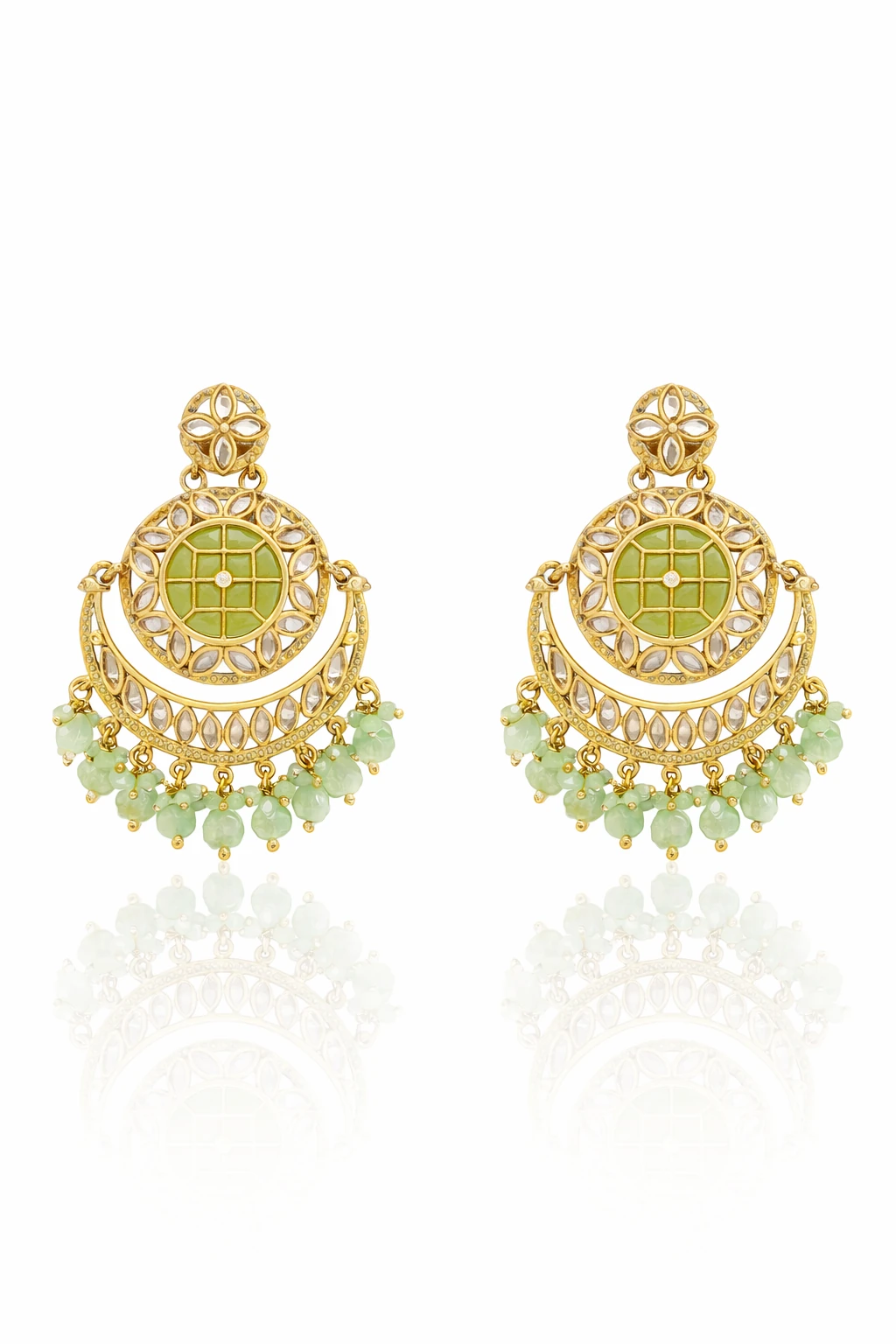 Elegant Green Stone Chandbali Jhumkas with Mint Beads