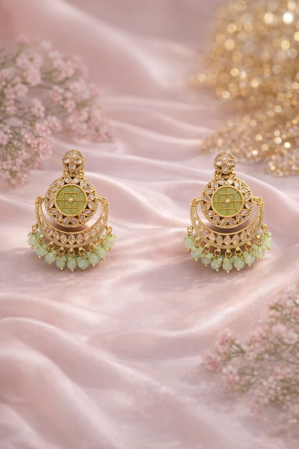 Indulge in the elegance of these exquisite Chandbali Jhumkas, a true testament to refined artistry. Meticulously crafted, each jhumka showcases an alluring blend of gold-tone metal and soft, pastel embellishments, exuding a sophisticated charm. The combination of intricate patterns and the luxurious design makes these jhumkas a standout addition to any jewelry collection. These Chandbali Jhumkas are adorned with delicate green stone accents that gracefully dangle, adding a touch of opulence and movement. The craftsmanship is apparent in the intricate detailing, with a harmonious fusion of traditional motifs and contemporary elegance. The high-quality finish ensures these earrings catch the light beautifully, enhancing their stunning appeal. Perfect for special occasions, these jhumkas will elevate any ensemble with their regal allure. Whether you're attending a wedding, a festive celebration, or looking for the perfect gift, these Chandbali Jhumkas are an exceptional choice. Elevate your style with the timeless beauty of these exquisite adornments.