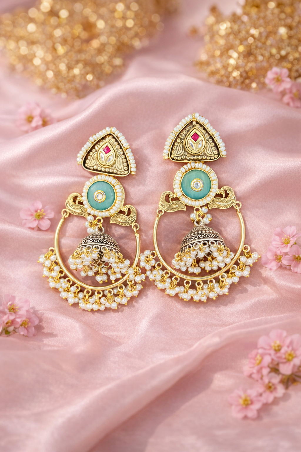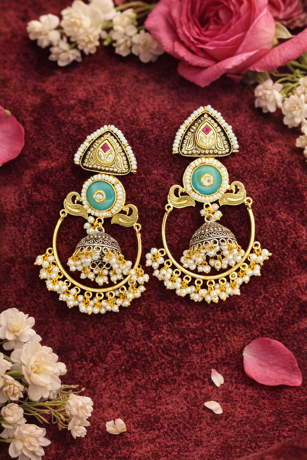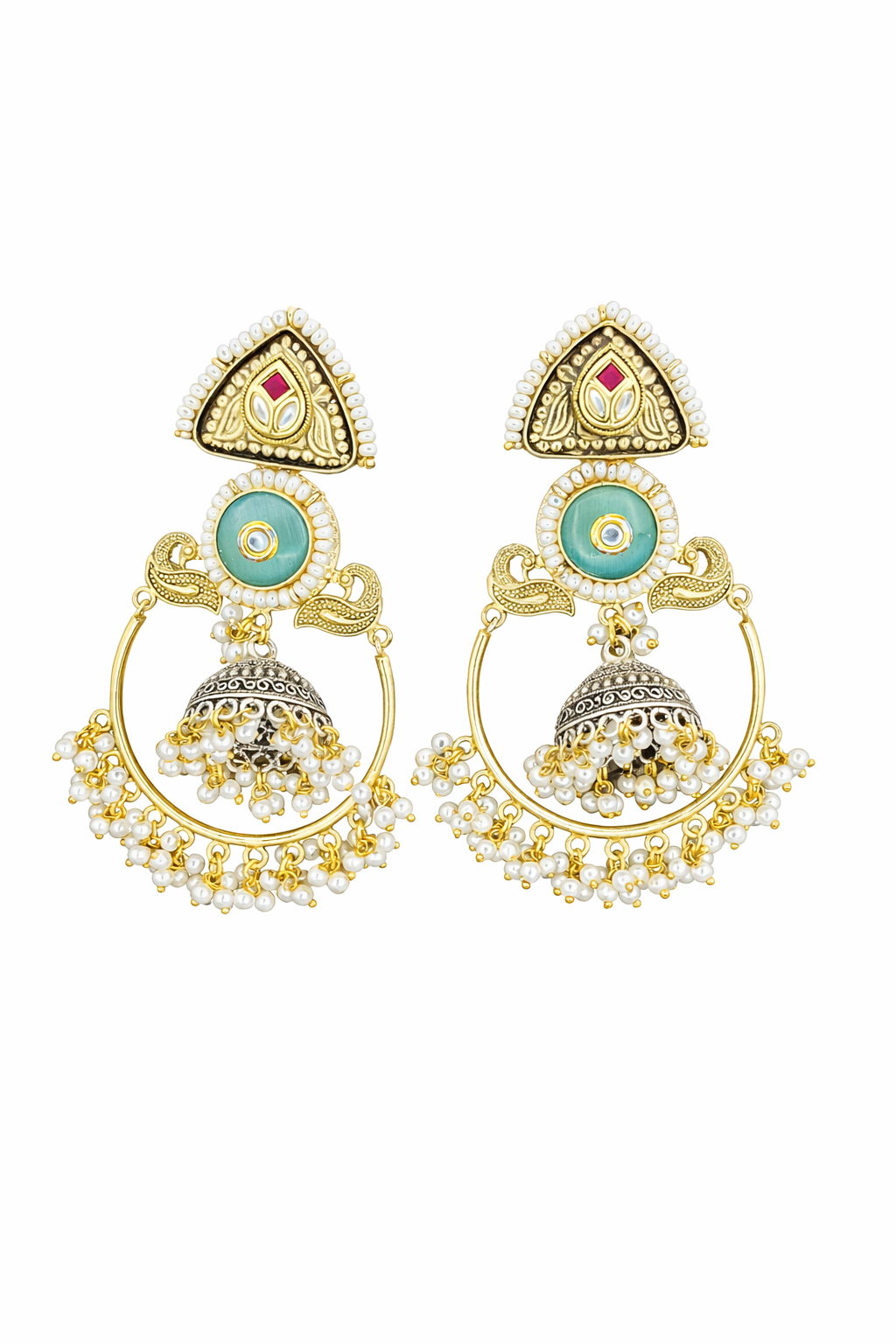 Elevate your jewelry collection with our exquisite Kundan designer jhumka. These standout earrings capture the essence of elegance with their intricate design, featuring a harmonious blend of traditional and contemporary styles. The dazzling top triangle offers a striking pattern adorned with delicate beading, while the vibrant turquoise green center adds a pop of color, making these jhumkas a captivating accessory for any ensemble. Crafted with meticulous attention to detail, our Kundan designer jhumka showcases superior craftsmanship. The gold-toned metal seamlessly blends with the intricate Kundan work, highlighted by a symphony of pearls that cascade beautifully. The ornate dome-shaped jhumka is intricately patterned, showcasing the artistry that defines this timeless piece. Each element is carefully arranged to create a piece of enduring beauty. Whether dressing up for a festive occasion or seeking a unique gift, these Kundan designer jhumkas are perfect for adding a touch of sophistication. Enrich your look or surprise a loved one with this elegant pair. Enhance your collection with these timeless treasures, and experience the allure of premium craftsmanship today.