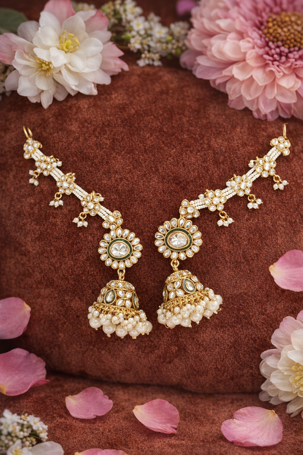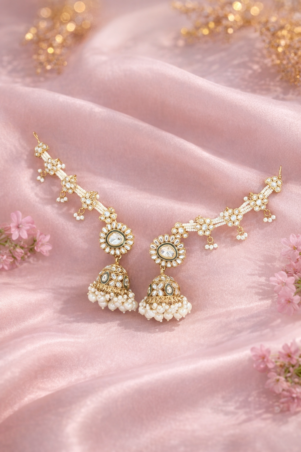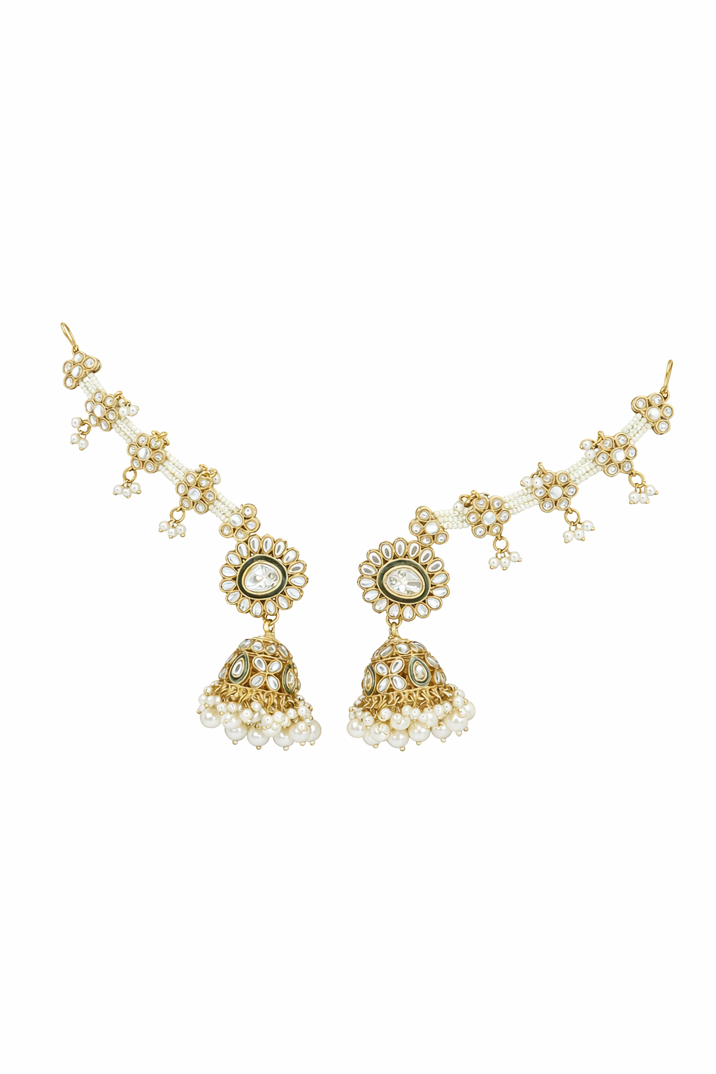 Introducing our exquisite Over the Ear Earrings, a stunning pair of Kundan Jhumkas designed to add a touch of elegance to any attire. The rich gold hue beautifully contrasts with the intricate white and green embellishments, creating an eye-catching accessory that exudes sophistication. Nestled gracefully against a textured brown backdrop, these earrings are made to captivate and charm. Crafted with meticulous attention, these Kundan Jhumkas showcase the timeless beauty of traditional Indian craftsmanship. The earrings feature intricate floral motifs embellished with white stones, leading to gracefully dangling, pearl-adorned jhumkas. The delicate design elements reflect the superior craftsmanship and luxury that define our jewellery, offering a truly premium experience. Perfect for weddings, festive celebrations, or gifting to someone special, these Kundan Jhumkas are sure to leave a lasting impression. Elevate your jewellery collection with this quintessential piece, and indulge in the luxury of timeless elegance. Discover the allure of our Over the Ear Earrings today.
