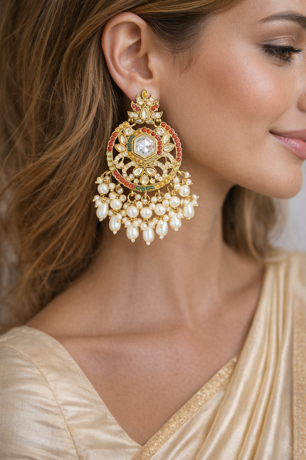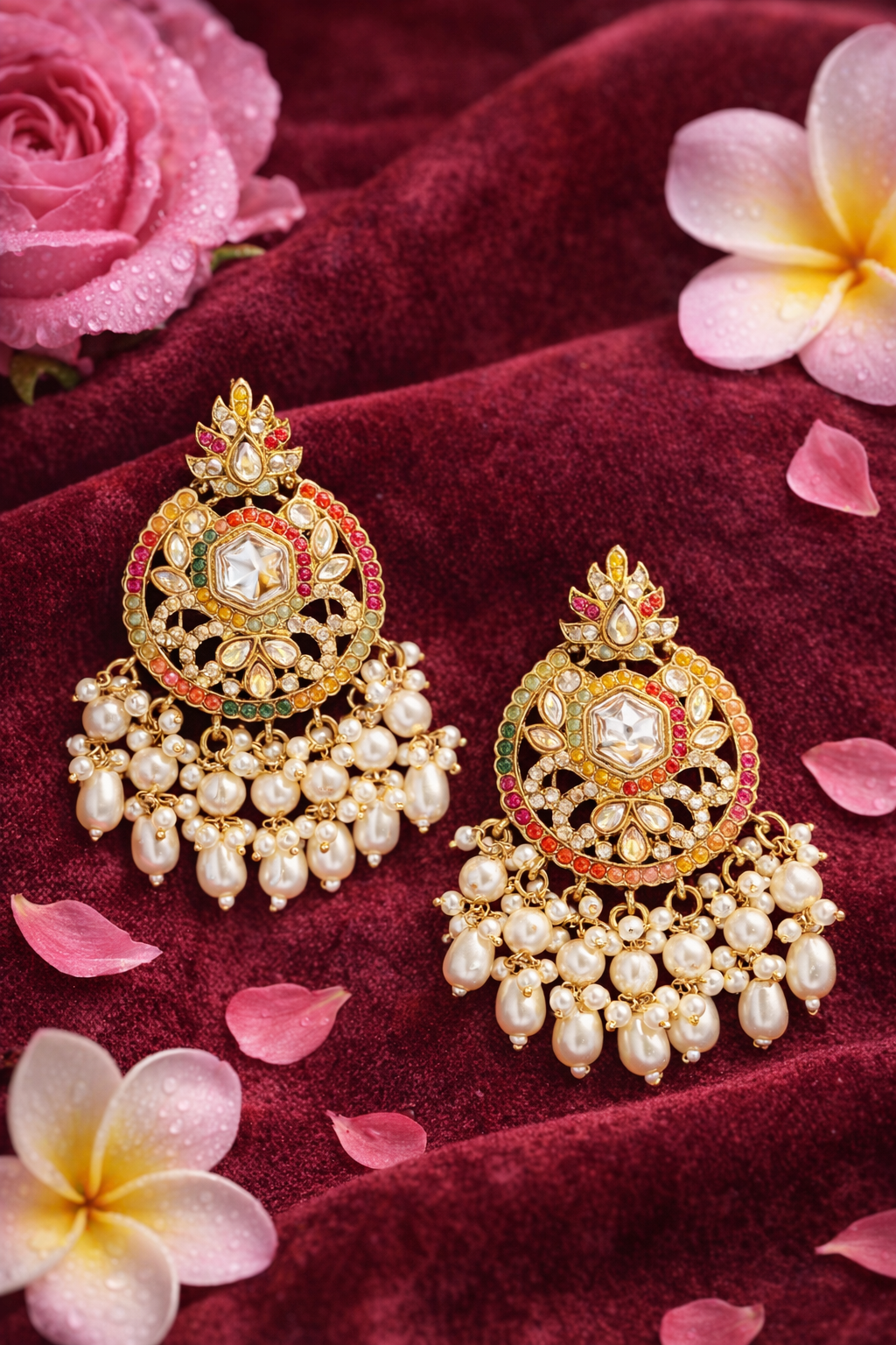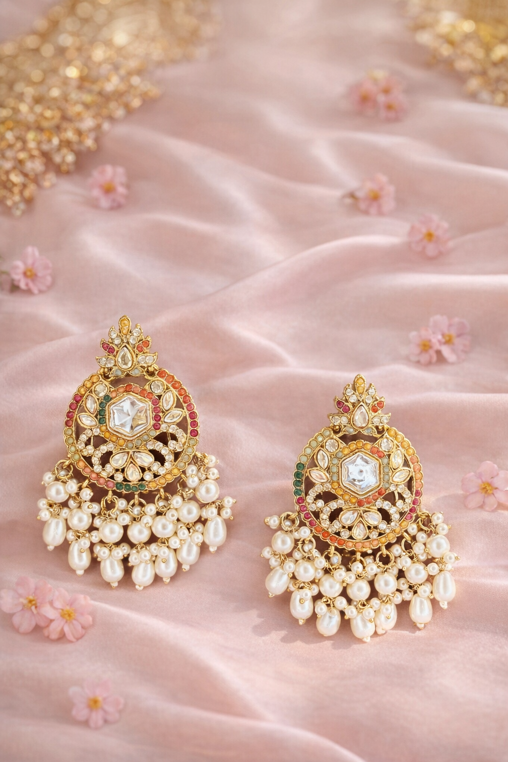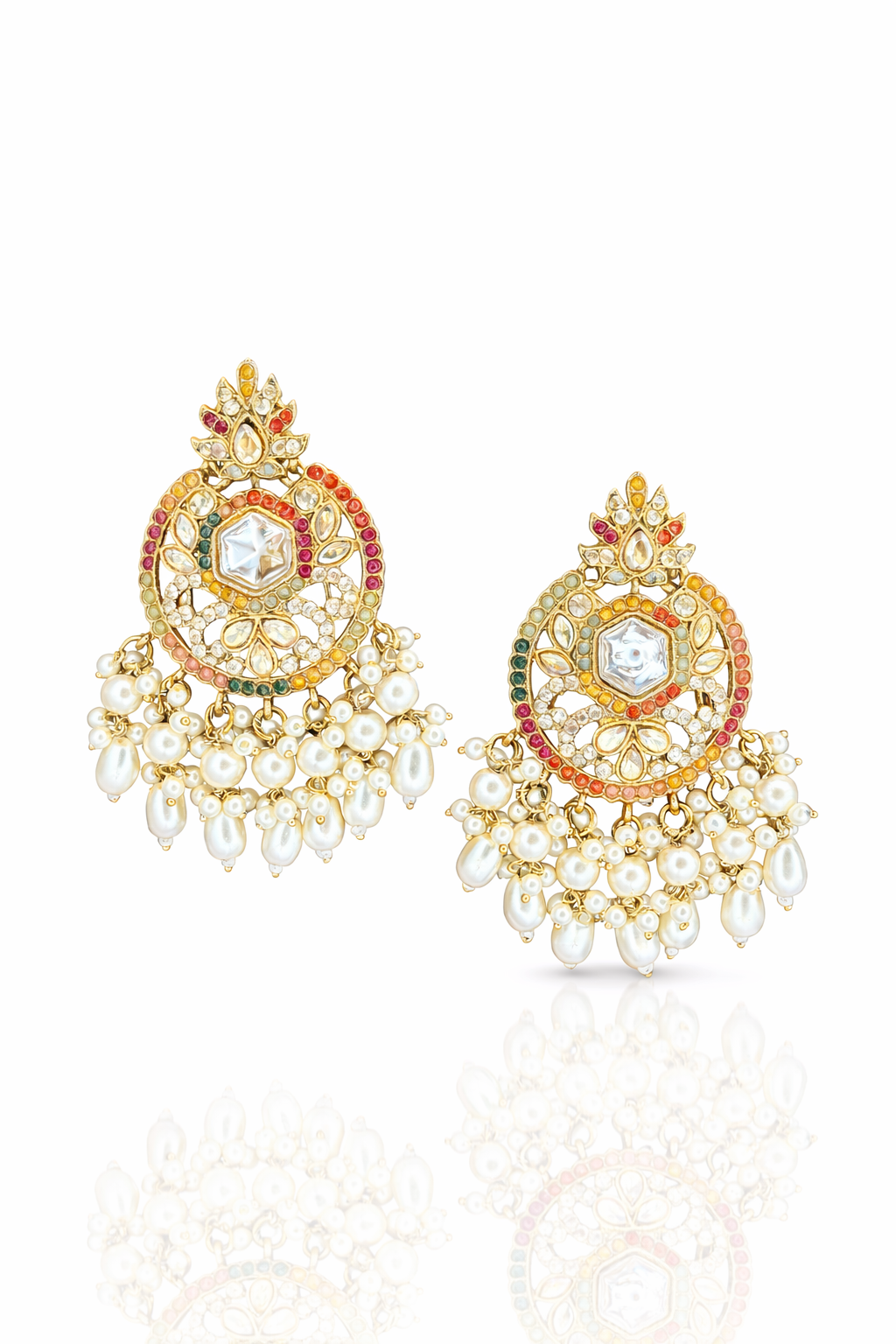 Elegant Multicolor Kundan Jhumkas with Pearl Drops