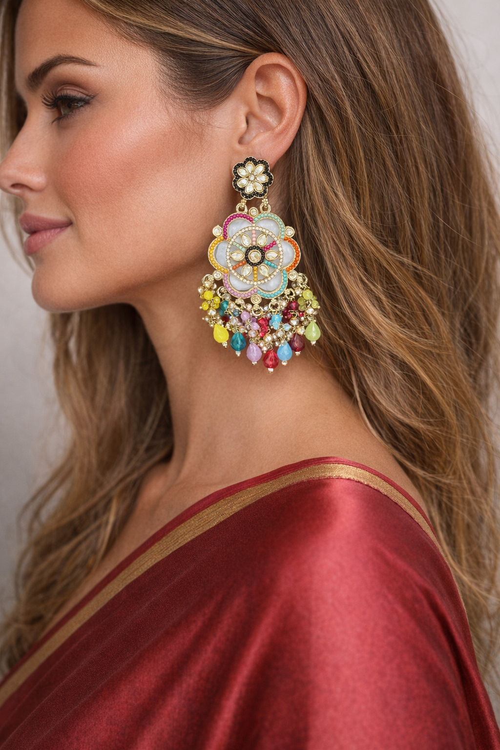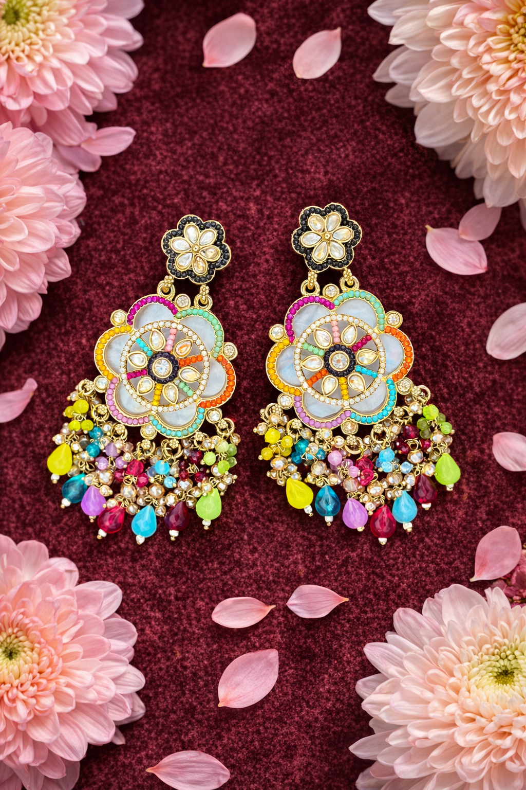 Vibrant Floral Multicolor Stone Jhumkas with Dangling Beads