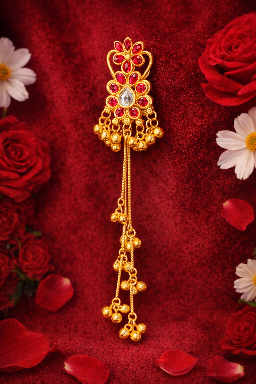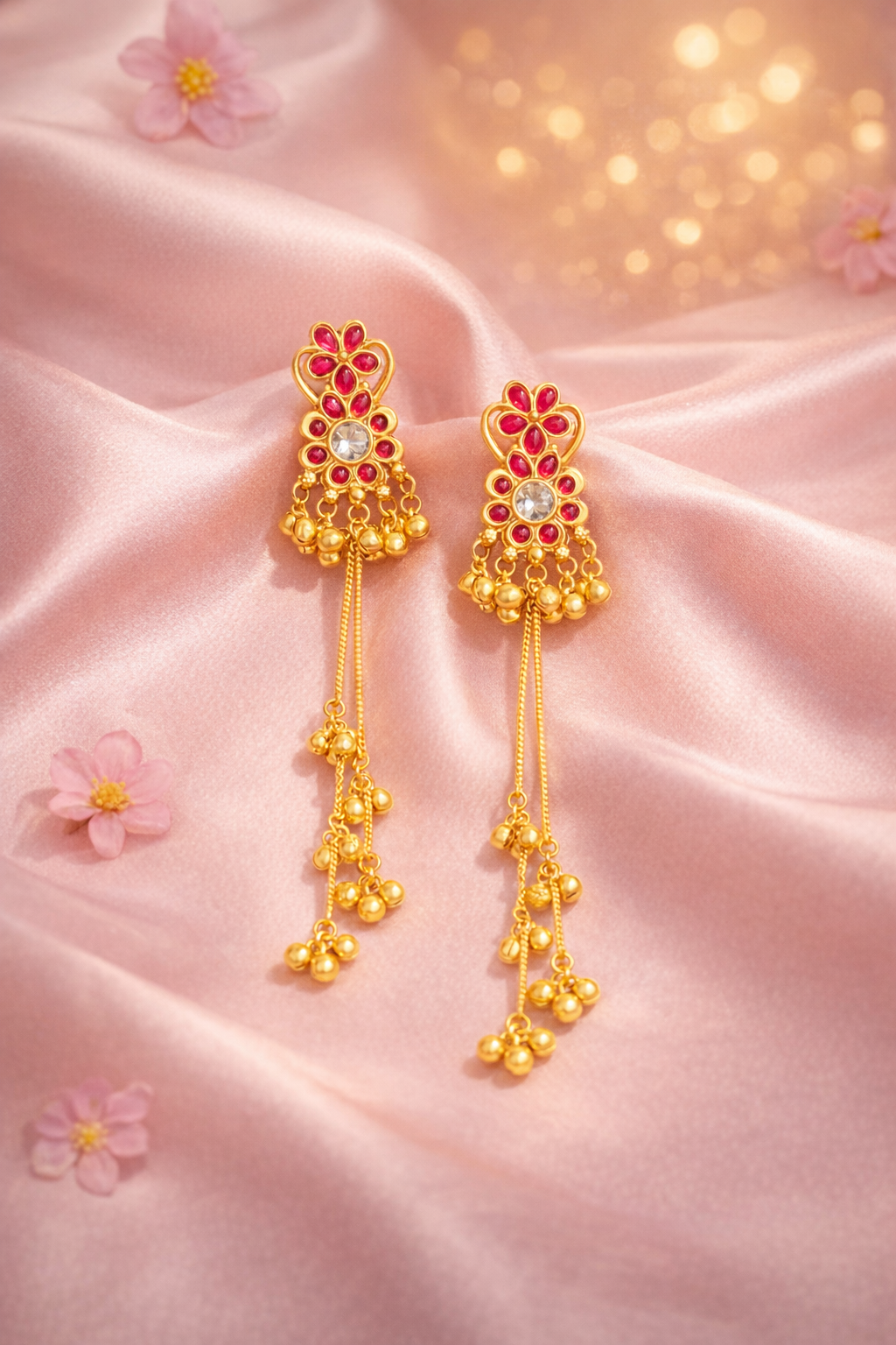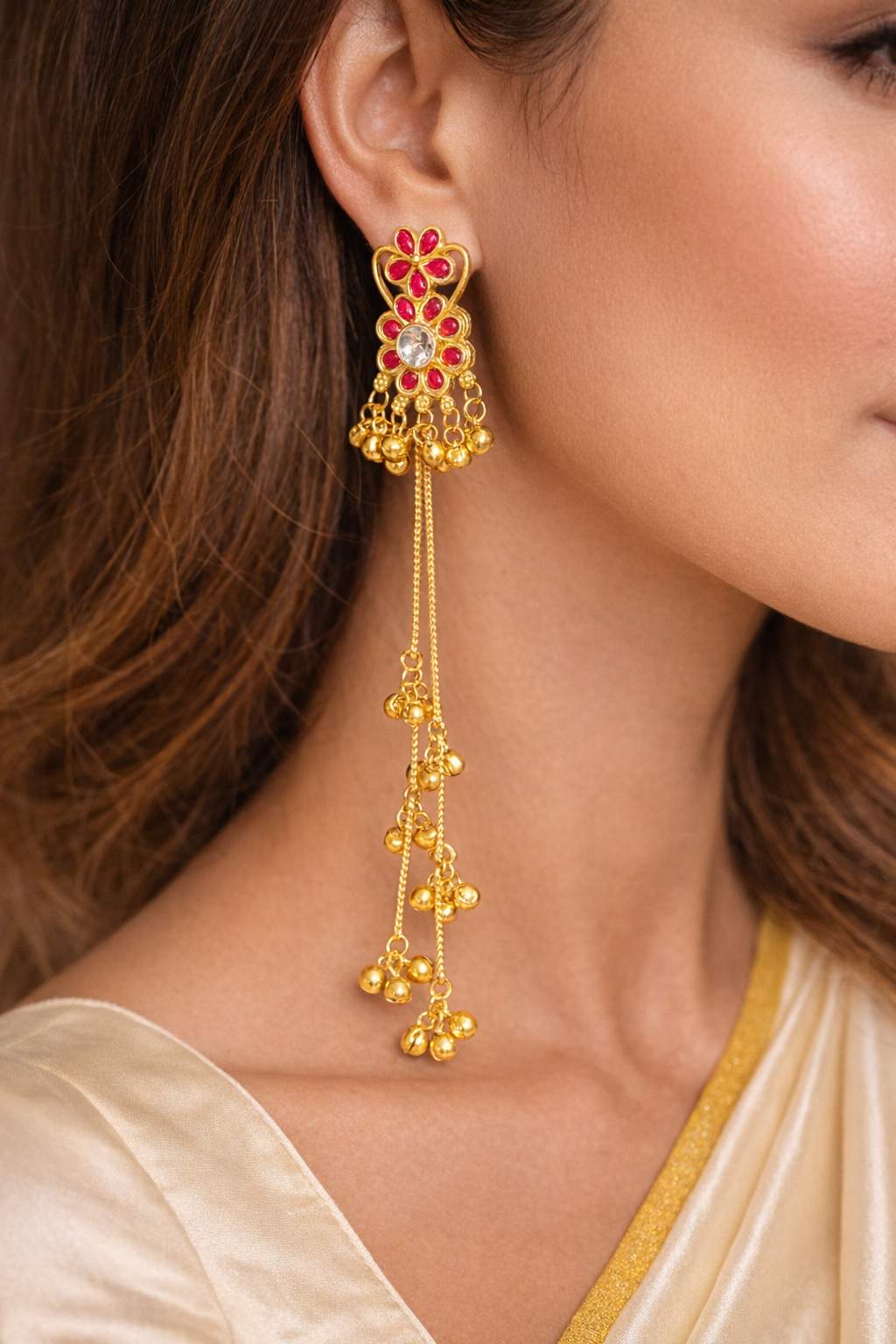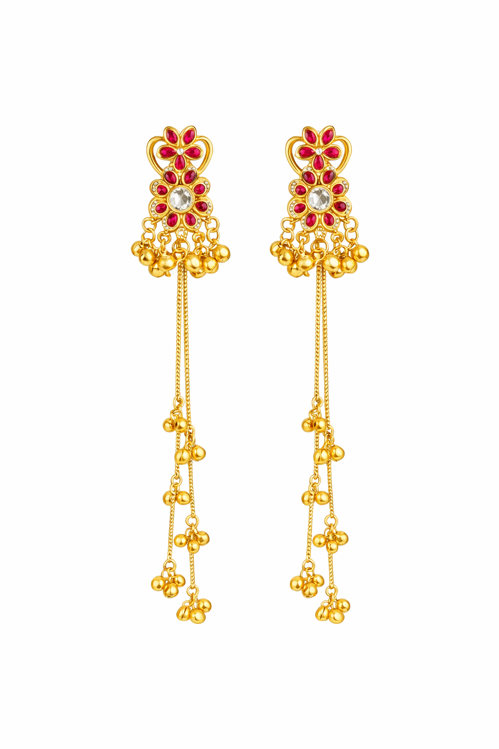 Discover the allure of tradition with our exquisite Kashmiri earrings, where timeless elegance meets contemporary design. These earrings captivate attention through a stunning blend of vibrant red gemstones and shimmering crystal centers, highlighted against a luxe gold finish. The intricate upper floral design seamlessly transitions into a cascade of delicate golden beads, creating a sense of graceful movement with every step. Crafted with precision and care, these Kashmiri earrings exemplify exceptional craftsmanship. The design features intricate patterns embellished with radiant red stones that form a lovely floral motif. The golden bead tassels add a distinctive touch, showcasing the meticulous attention to detail and dedication to quality that defines our brand. Perfect for any festive occasion or celebration, these Kashmiri earrings make a thoughtful gift for someone special. Elevate your jewelry collection with this timeless piece, and let the elegance of tradition adorn your style. Bring home a piece of cultural heritage today.