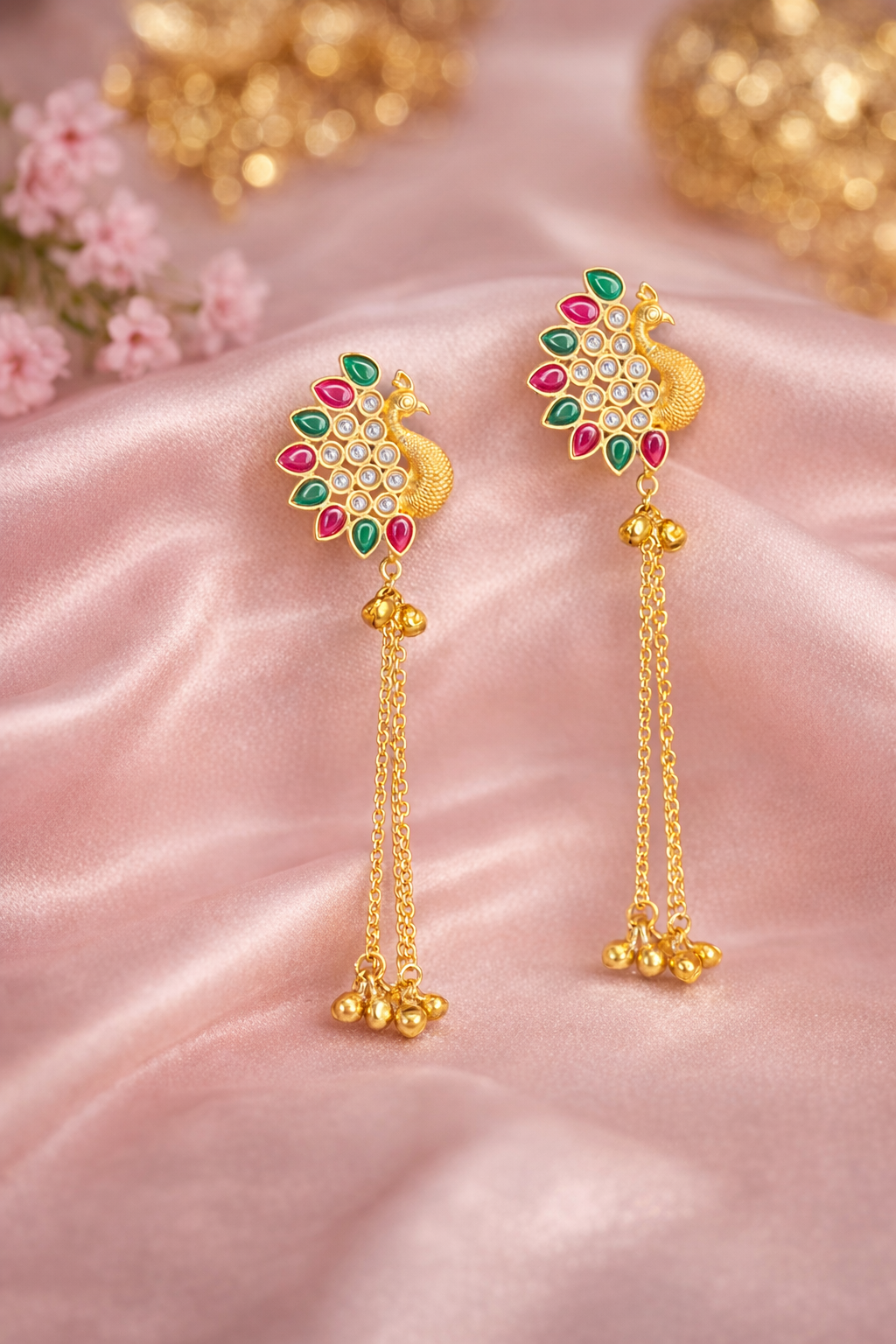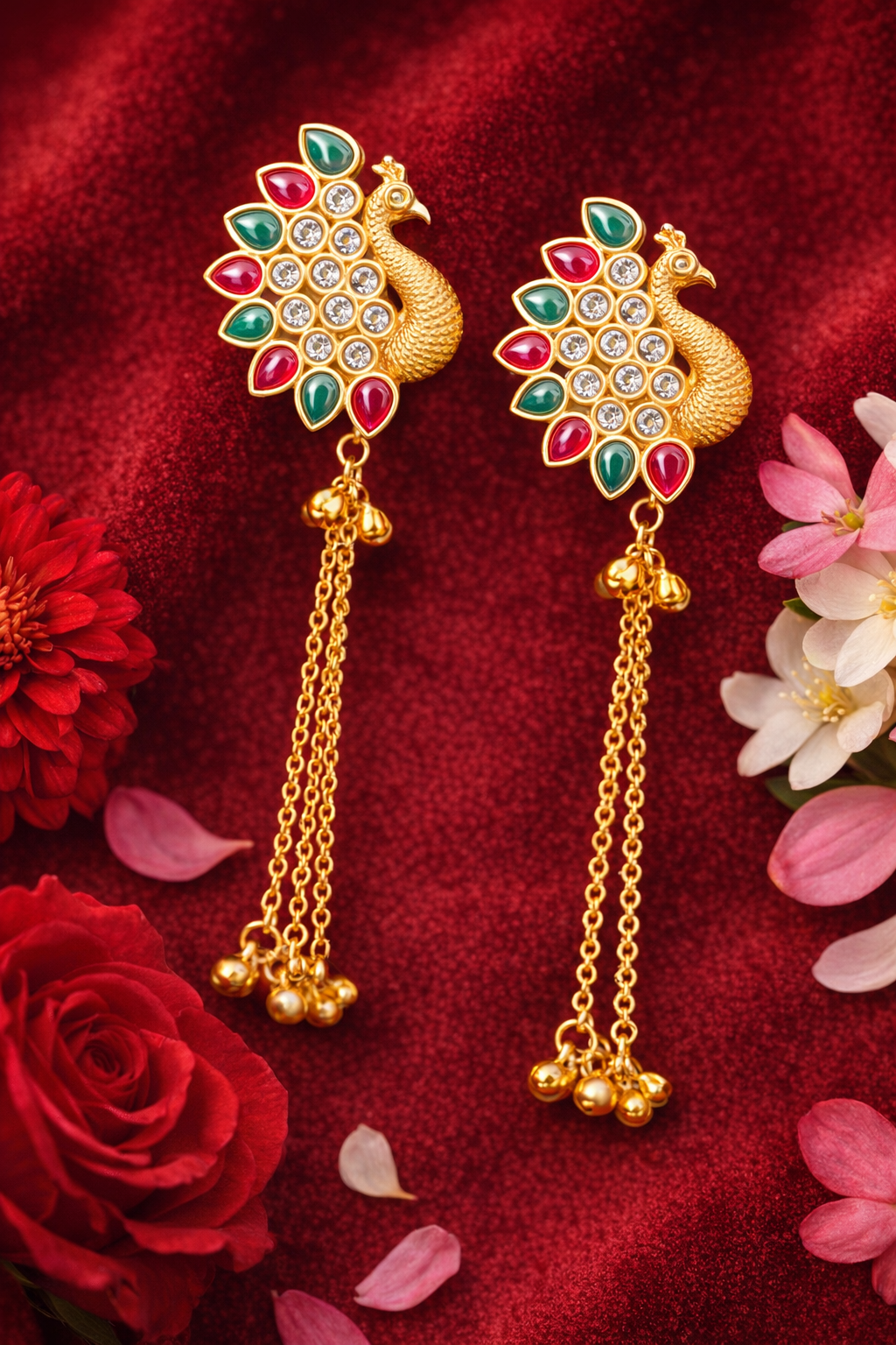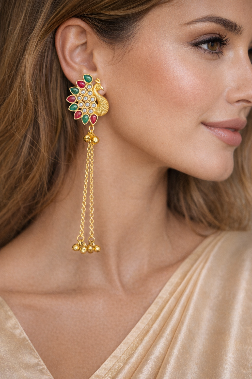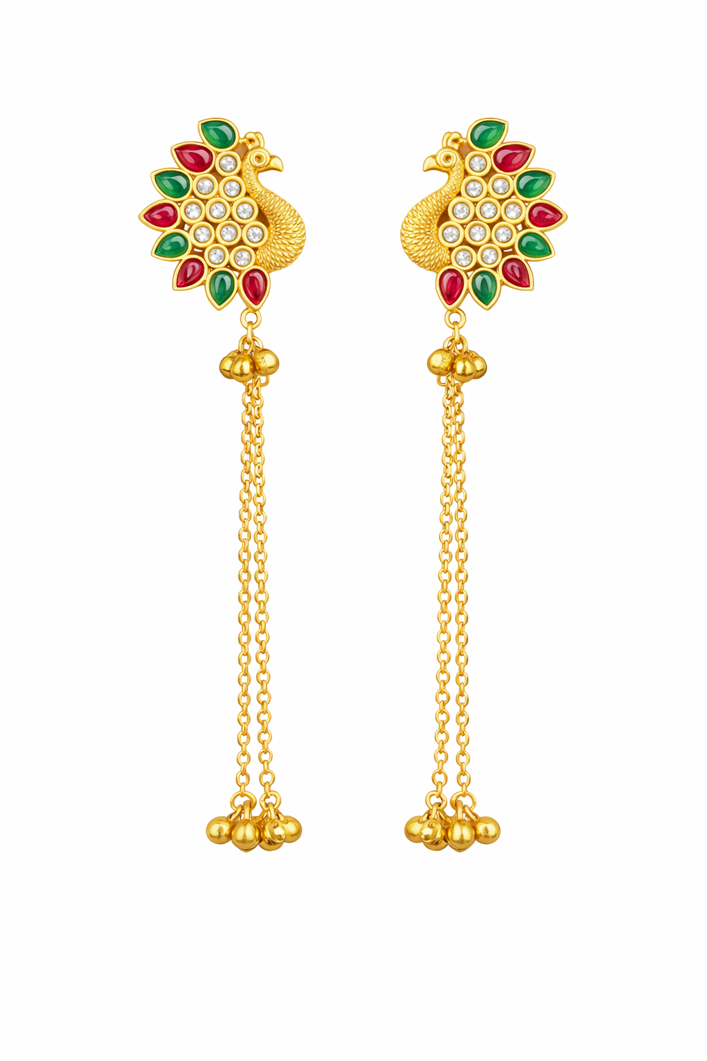 Elevate your elegance with our exquisite Kashmiri earrings, a true embodiment of artistry and grace. These earrings showcase an enchanting peacock motif adorned with striking red and green enamel accents, symbolizing timeless beauty and vibrant traditions. The cascading gold chains elegantly sway, adding a touch of sophistication and movement to your ensemble. Crafted with meticulous attention to detail, our Kashmiri earrings are made from premium materials, featuring intricate goldwork that enhances their luxurious appeal. The use of delicate white stones enhances the brilliance, creating a captivating contrast against the rich enamel inlays. The craftsmanship speaks volumes of skill, reflecting the heritage and finesse of Kashmiri artistry. Perfect for special occasions or as a thoughtful gift, these Kashmiri earrings add a statement of elegance to any outfit. Whether attending a wedding or a festive celebration, let these earrings be your go-to accessory. Enhance your collection with this masterpiece today and experience the allure of true elegance.