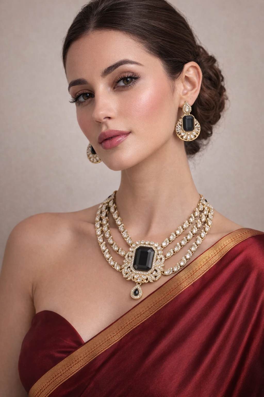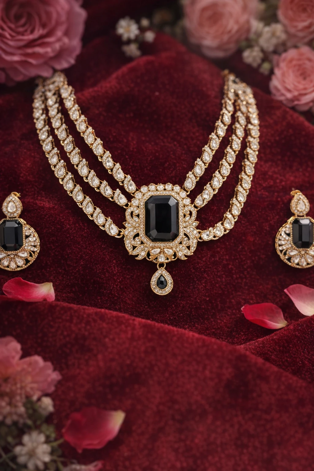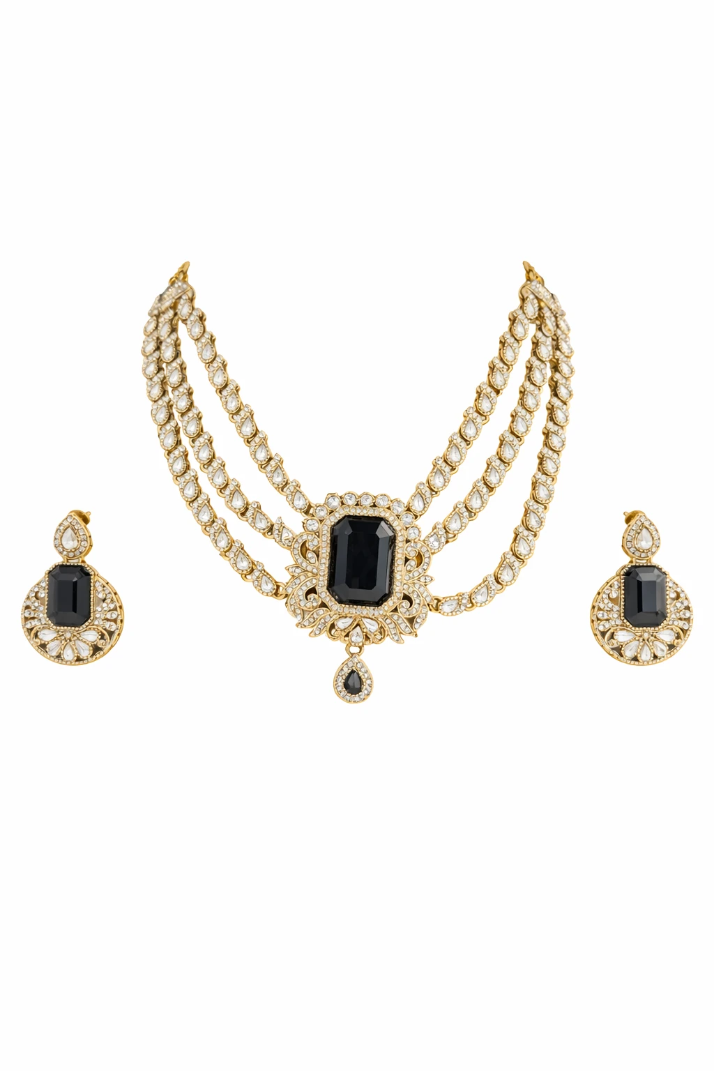 Introducing the exquisite Kundan necklace, a stunning piece that embodies the essence of timeless elegance. This masterpiece showcases three luxurious strands of intricately arranged teardrop-shaped stones, leading gracefully to a striking central pendant. The deep, rich green stone at its heart is framed by a halo of shimmering kundan work, exuding an aura of regal sophistication. Accompanied by matching earrings, this set is displayed against a plush, deep-red velvet backdrop that elevates its luxurious appeal. Crafted with attention to detail, this Kundan necklace features a perfect blend of tradition and modernity. Each stone is meticulously set, reflecting the skilled craftsmanship synonymous with our premium Indian jewelry brand, Savyra. The radiant kundan work perfectly complements the bold green stones, creating a harmonious balance that embodies luxury. Ideal for elegant gatherings or as a thoughtful gift for loved ones, this necklace is perfect for any occasion needing a touch of refinement. Elevate your style and make every moment unforgettable with the captivating charm of this premium Kundan necklace. Indulge in elegance with Savyra today.