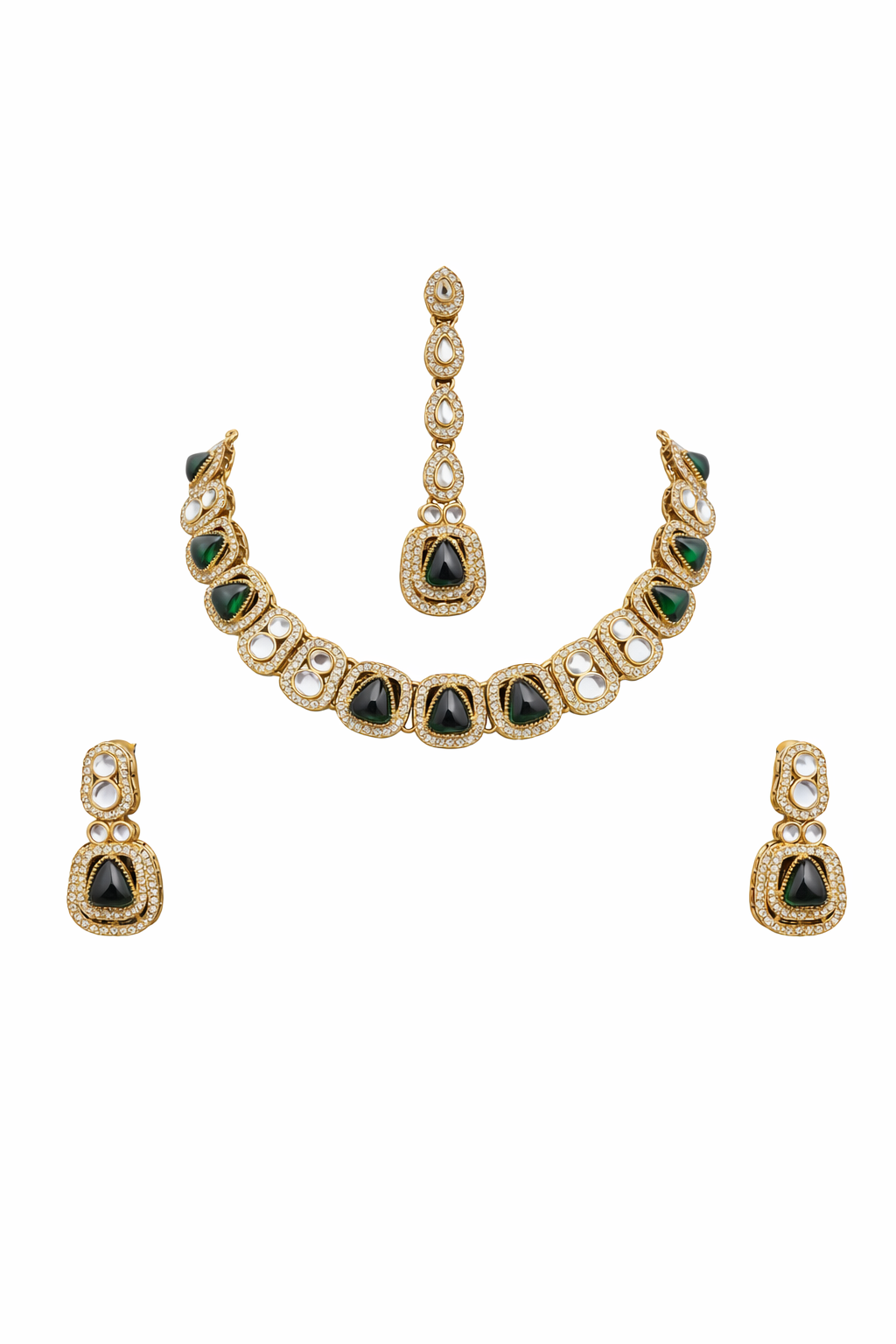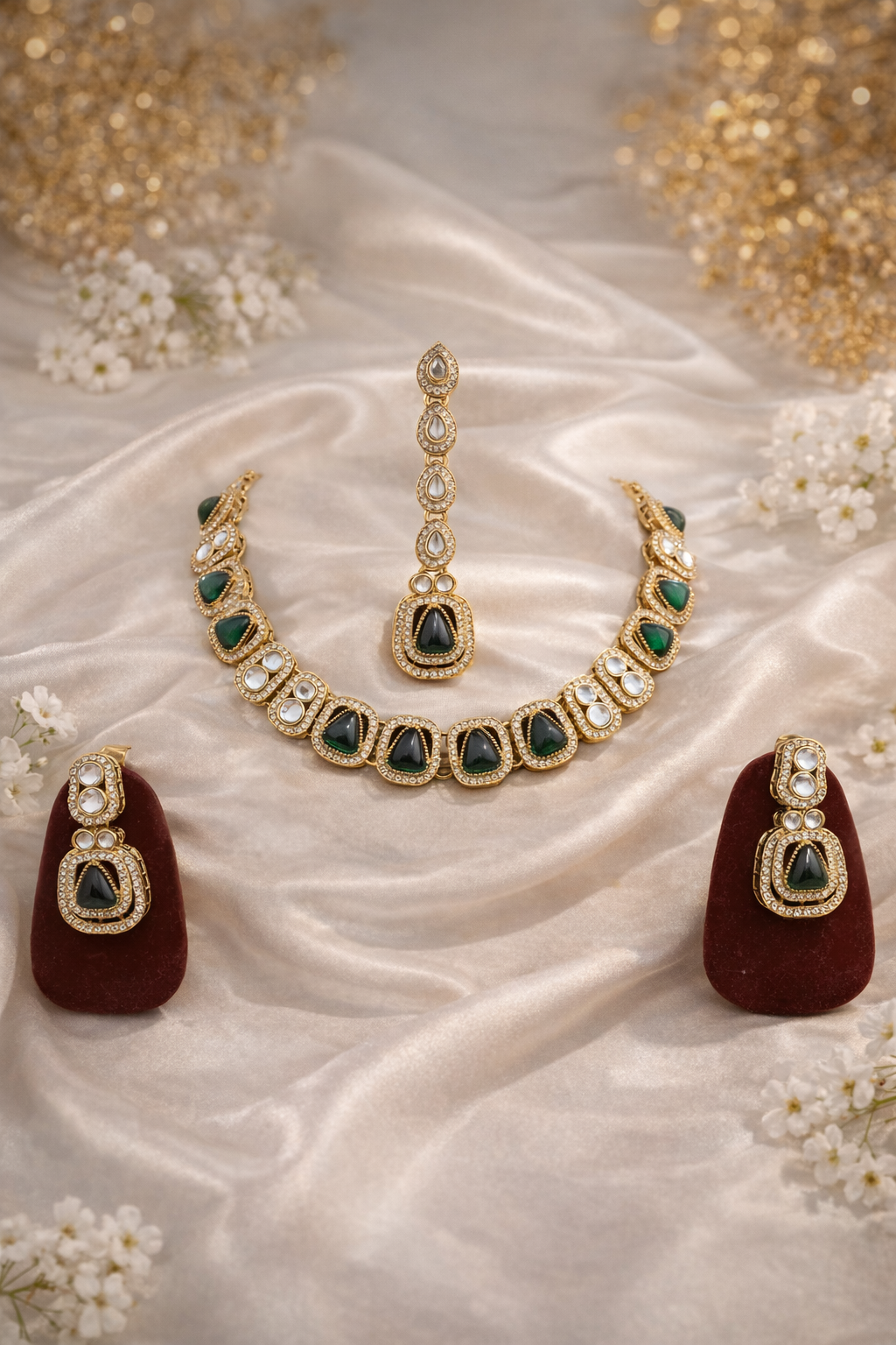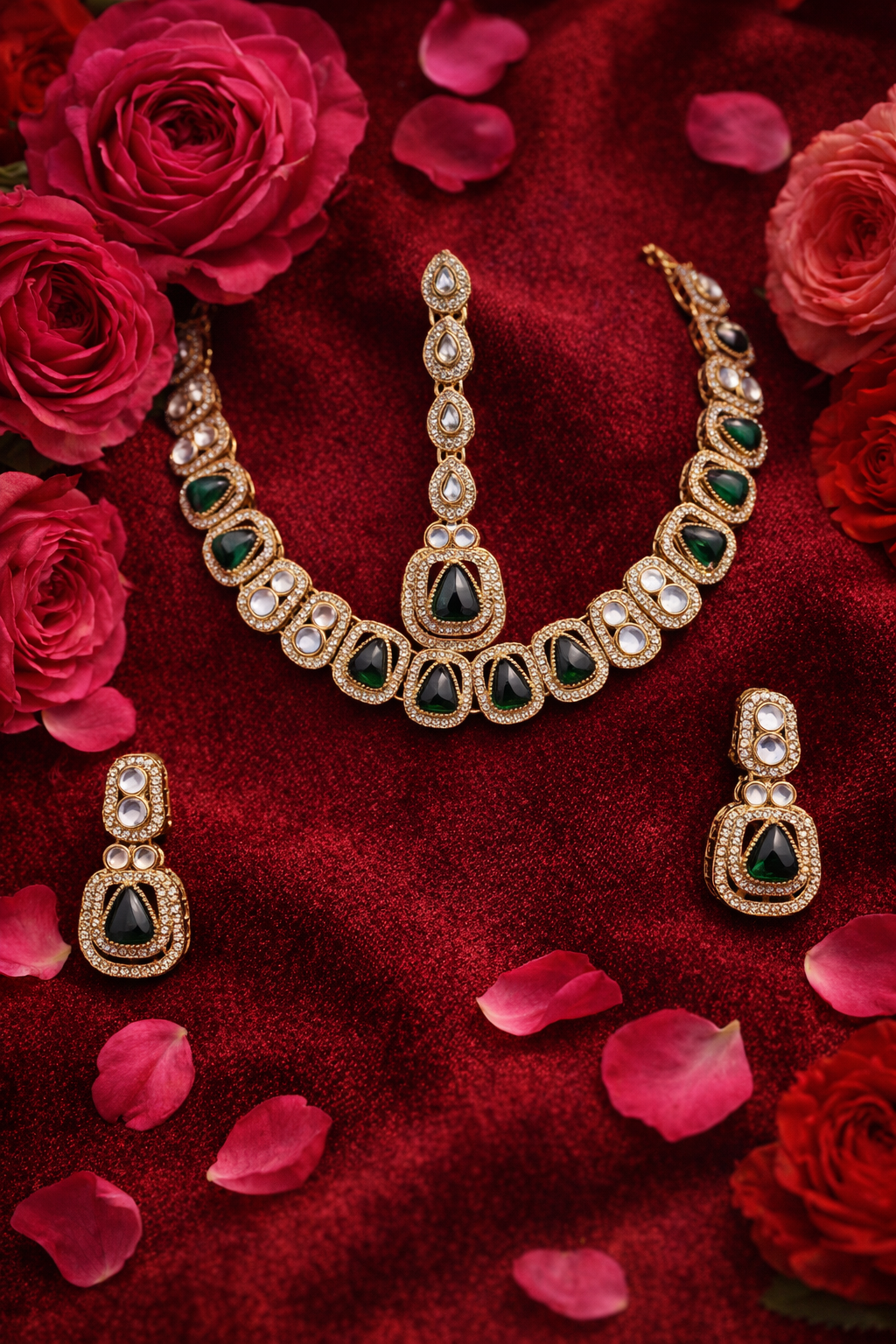 Introducing the exquisite polki necklace set, a masterpiece of elegant craftsmanship. This set boasts a striking combination of shimmering stones set on a rich maroon velvet backdrop, capturing attention with its timeless allure. The gleaming necklace and matching earrings are designed for those who appreciate the luxury of traditional aesthetics with a modern appeal. The polki necklace set is meticulously crafted with intricate detailing. The necklace features alternating green and white stones, each encased in a series of gold-toned settings, adding a touch of sophistication to any ensemble. The matching earrings complement the necklace perfectly, ensuring a harmonious look that’s both regal and refined. The superior craftsmanship highlights the opulence of this set, making it a truly aspirational piece. Perfect for weddings, festive celebrations, or as an extraordinary gift, this polki necklace set promises to elevate any occasion. Embrace the luxury and let this stunning set be the highlight of your jewelry collection. Discover elegance with every wear; make this masterpiece yours today.