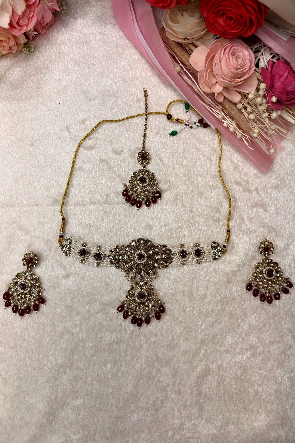 Introducing the exquisite Kundan Choker Necklace Set with Maang Tika, a masterpiece from Savyra's premium collection. This captivating set features a choker and matching earrings, exuding opulence with its intricate design. Adorned with rich maroon and white stones, this Kundan choker necklace set adds a royal touch to any ensemble. Crafted with meticulous attention to detail, the set combines the timeless elegance of Kundan and Polki. The choker showcases a floral pattern, highlighted with glistening maroon gemstones and delicate pearl accents. The earrings mirror the choker's design, offering a harmonious and polished look, perfect for those who appreciate the art of fine jewelry. The Kundan choker necklace set is ideal for weddings, festive occasions, or as a thoughtful gift for a loved one. Its timeless beauty ensures it will be cherished for years to come. Elevate your style by adding this elegant piece to your collection today.