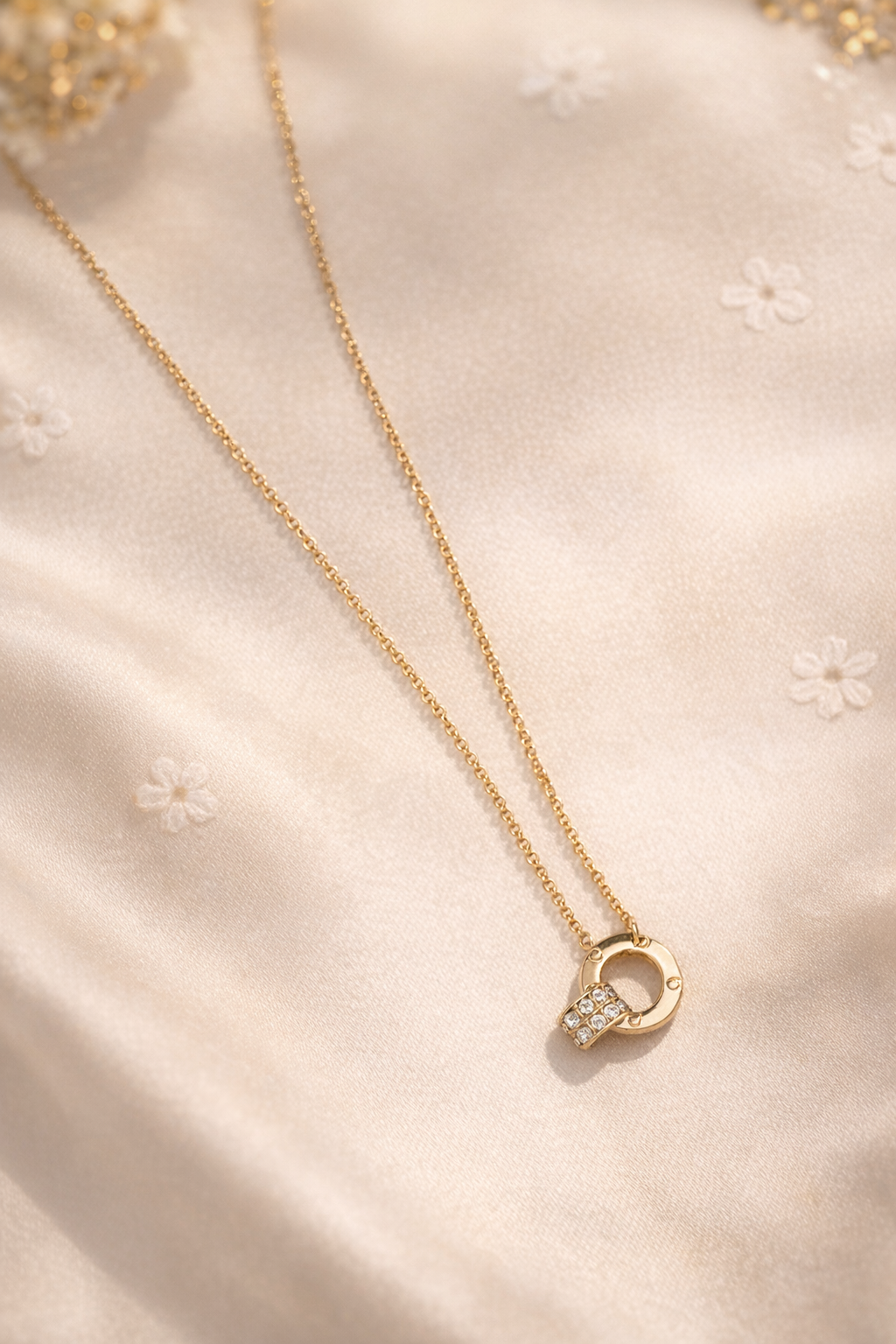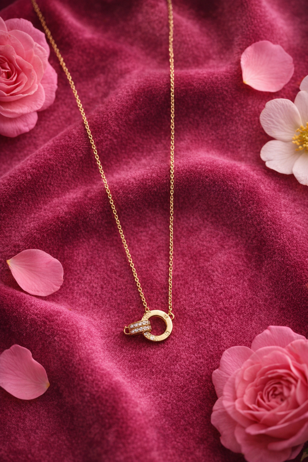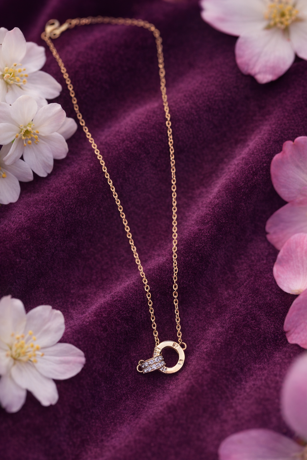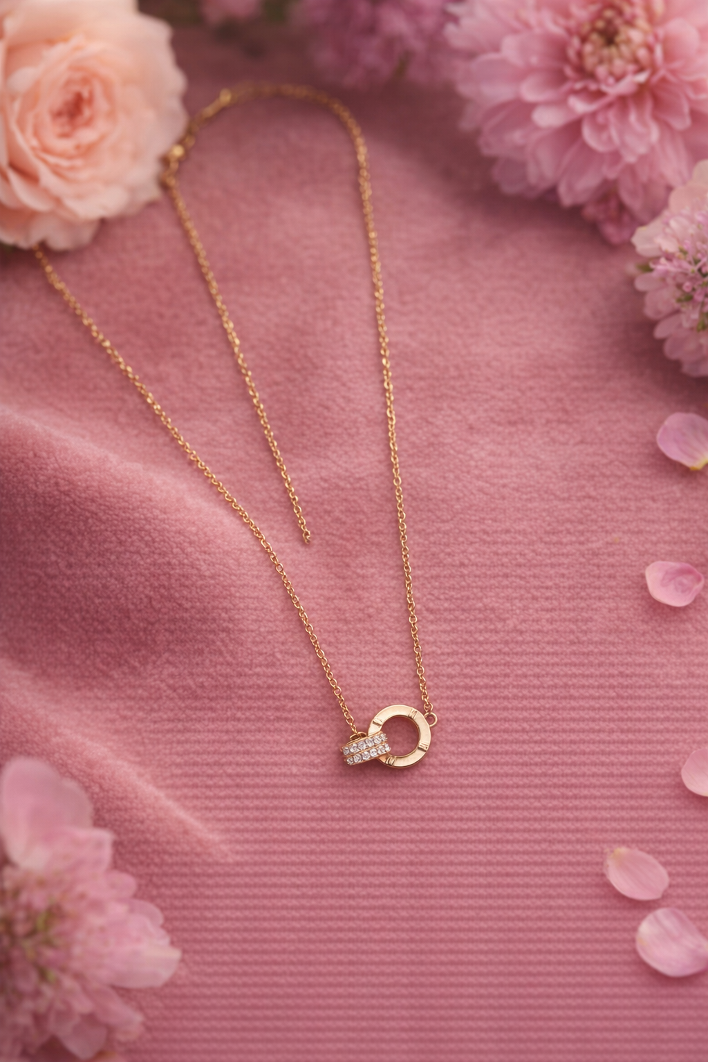 Discover timeless elegance with our exquisite gold circle pendant, a masterpiece of premium design and understated luxury. The pendant gleams with elegance, featuring a sleek circular form balanced on a delicate chain. Its subtle shimmer catches the light beautifully, making it a sophisticated accessory for any wardrobe. Crafted with meticulous attention to detail, this gold circle pendant stands out with its flawless finish. The circle is accentuated with a row of sparkling stones, adding a touch of brilliance. The smooth, polished surface of the gold complements the intricate stone setting, highlighting the craftsmanship that Savyra is renowned for. Every element is designed for both beauty and resilience. Perfect for any occasion, this gold circle pendant is an elegant choice for both day-to-day wear and special events. Its timeless appeal makes it an ideal gift for a loved one or a luxurious treat for yourself. Elevate your jewelry collection today with this premium piece from Savyra.