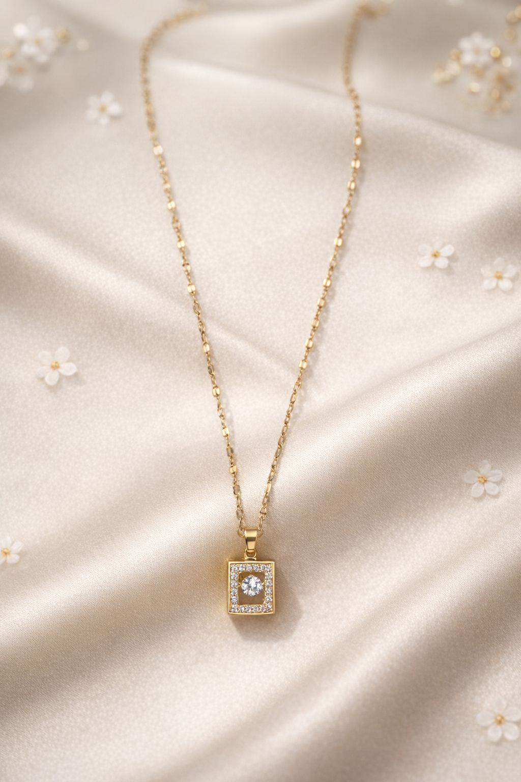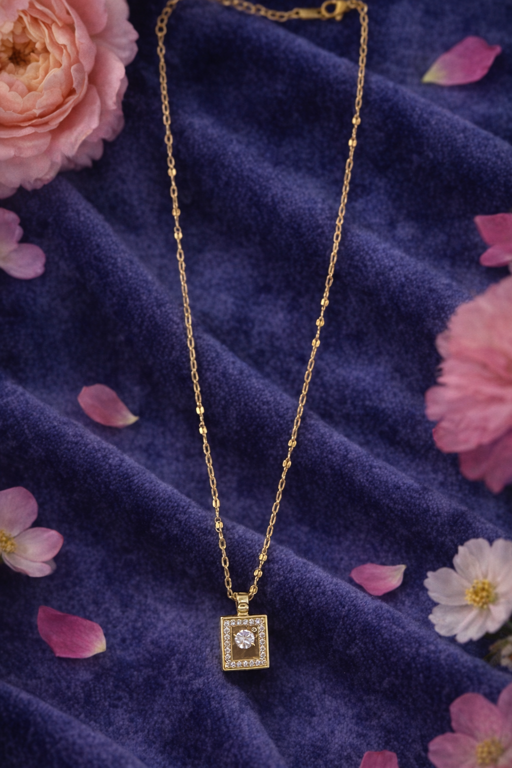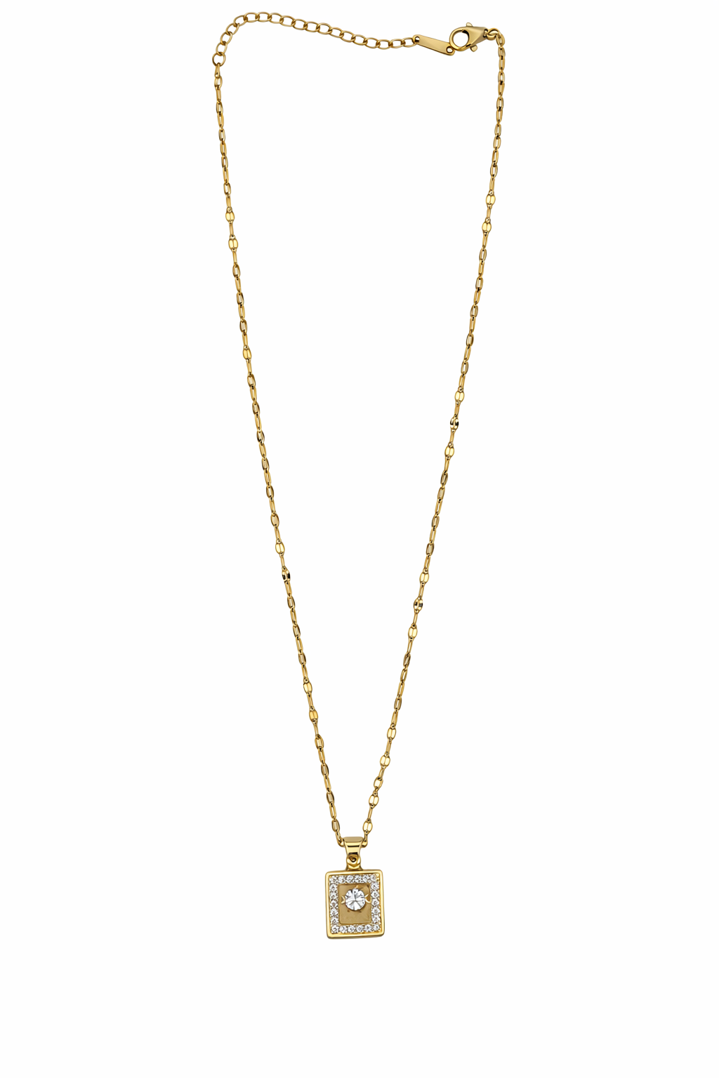 Introducing our exquisite gold pendant with diamond accent, a timeless piece that embodies elegance and sophistication. The pendant features a beautiful square design, gracefully set on a delicate gold chain. Its subtle shimmer complements any outfit, making it the perfect accessory for those who appreciate understated luxury. The intricate pattern in the chain adds a touch of refined elegance, ensuring that it captures attention effortlessly. Crafted from premium-quality gold, this pendant showcases impeccable craftsmanship. The central diamond accent, framed by a halo of smaller shimmering stones, creates a captivating focal point. The high-polish finish enhances its allure, offering a brilliant shine that catches the light beautifully. This gold pendant with diamond accent is not just a piece of jewellery; it's a testament to artisanal skill and exquisite design. Ideal for both everyday wear and special occasions, this pendant makes a thoughtful gift for someone special. Whether you're marking a milestone or simply treating yourself, this piece offers timeless appeal. Elevate your jewellery collection today with this stunning gold pendant with diamond accent. Discover the elegance and charm that will complement your style effortlessly.
