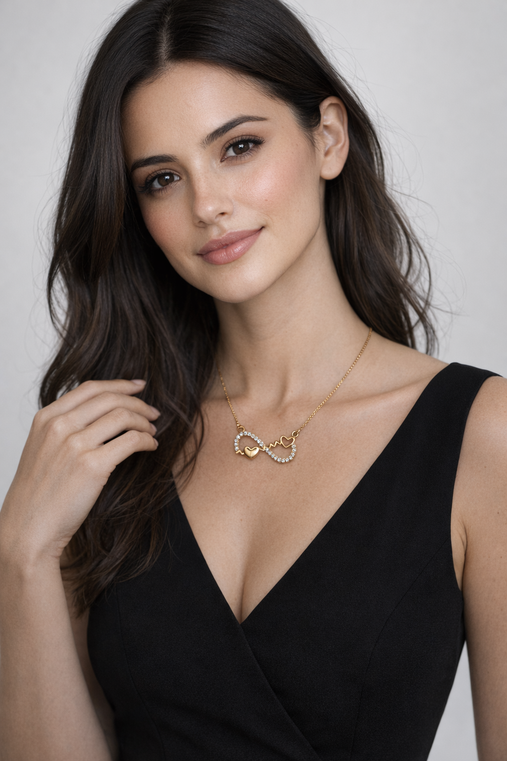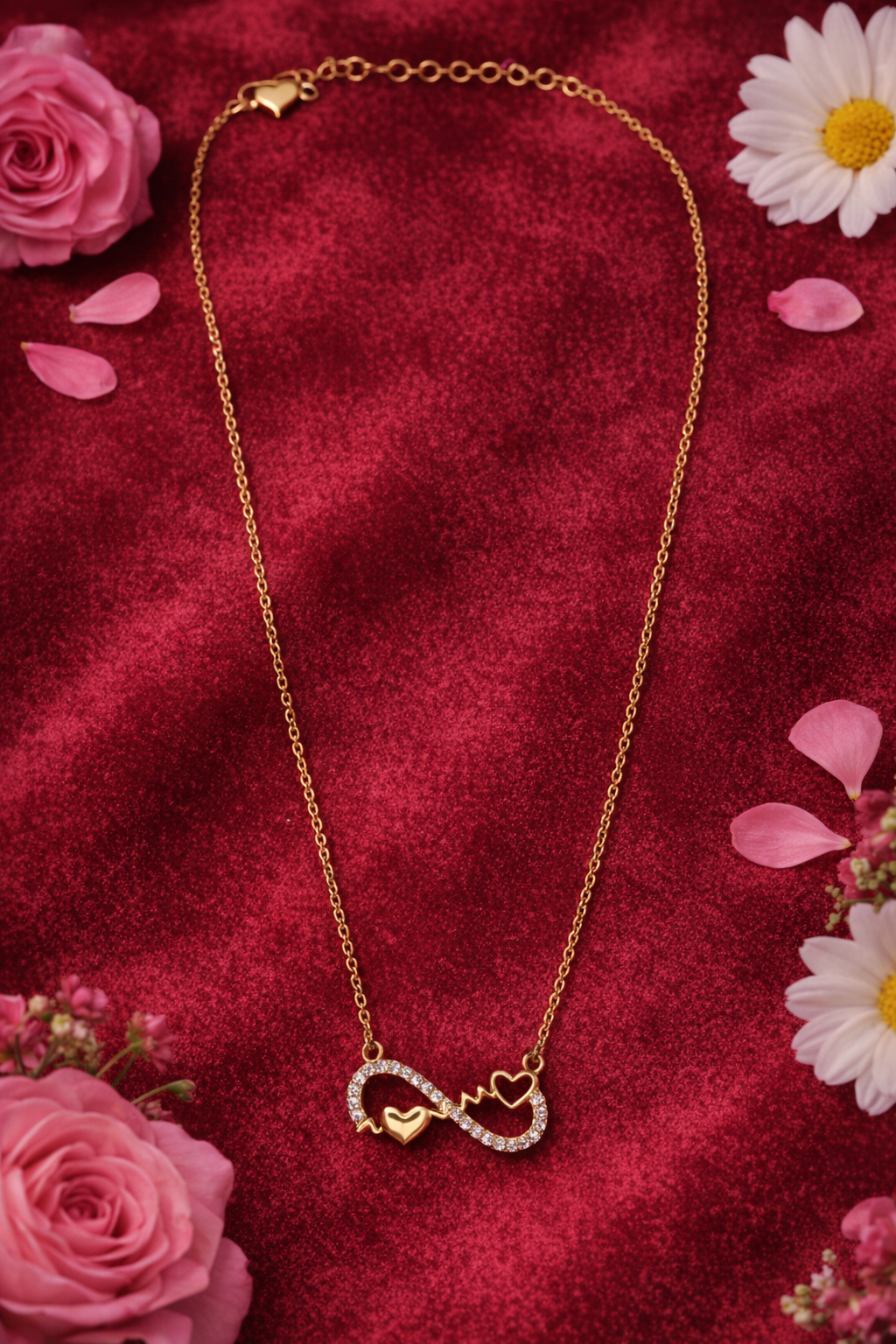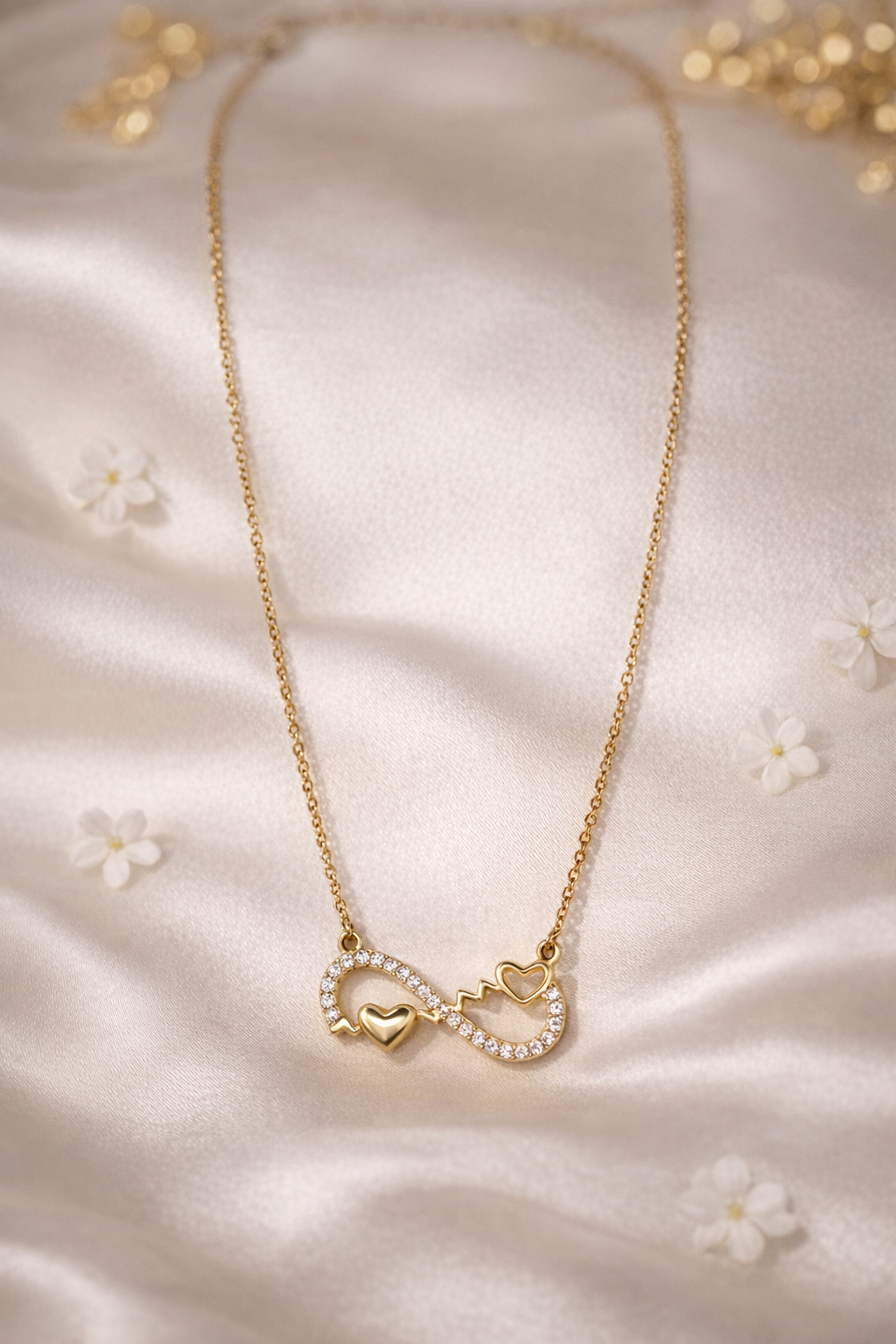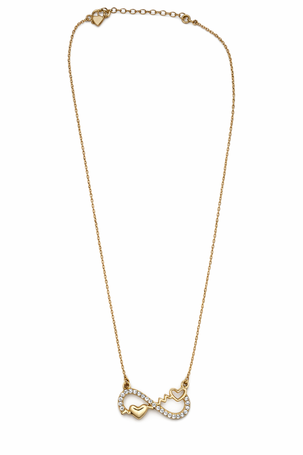 Introducing the exquisite gold infinity heart pendant, a statement piece that beautifully merges symbolism with elegance. This luxurious pendant features a delicate infinity symbol, adorned with shimmering stones, seamlessly interwoven with graceful heart motifs. Its warm golden hue exudes a timeless charm, making it a centerpiece of any jewelry collection. Crafted with meticulous attention to detail, the pendant boasts a sleek gold finish that highlights its intricate design. The infinity symbol, encrusted with sparkling crystals, adds a touch of sophistication, while the entwined hearts symbolize eternal love. Every element reflects premium craftsmanship, ensuring the pendant's longevity and enduring beauty. Perfect for any occasion, this gold infinity heart pendant is a meaningful accessory for birthdays, anniversaries, or just because. It’s not just a piece of jewelry but a heartfelt expression of love. Elevate your style or surprise a loved one with this elegant pendant. Own a piece of timeless allure today.