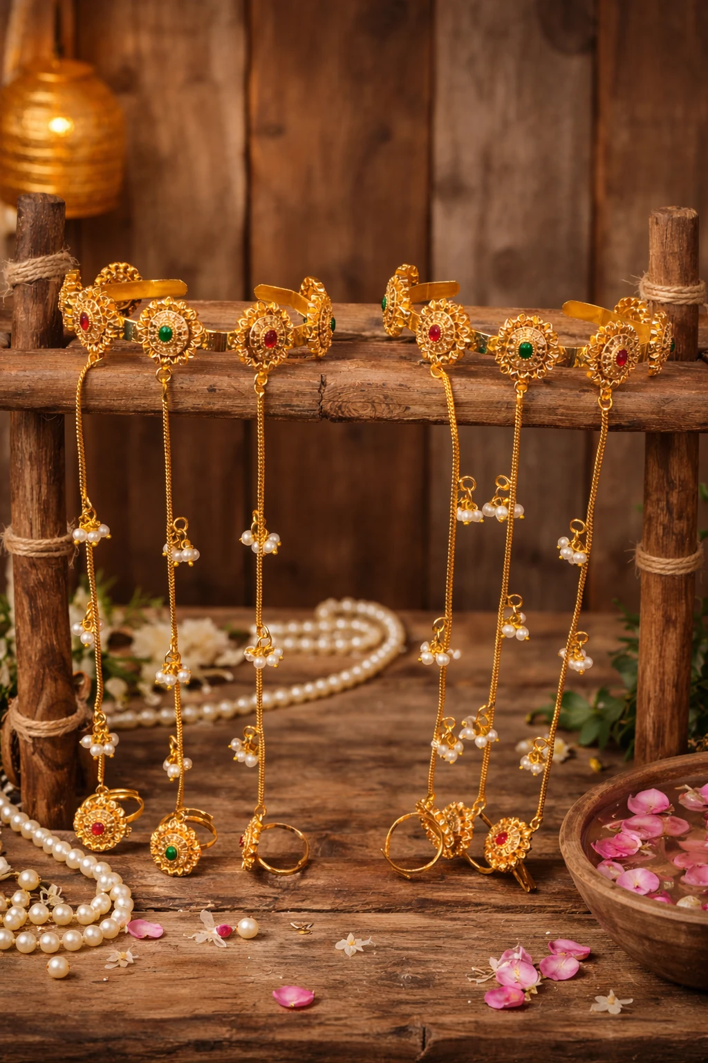 Introducing the exquisite gold hathphool from The शादी Shringaar collection by Savyra, a perfect blend of elegance and tradition. This eye-catching piece radiates opulence with its intricate gold finish and vibrant embellishments. The elaborate floral motifs adorned with striking red and green stones enhance its visual appeal, offering a touch of regal charm. Crafted with meticulous attention to detail, this gold hathphool showcases superior craftsmanship. The design features delicate chains adorned with clusters of pearls, gracefully draping across the hand. Each component is finely detailed, reflecting the luxurious quality synonymous with Savyra. The intricate gold plating lends a splendid richness to this timeless accessory. Wear this stunning gold hathphool on special occasions like weddings and festive celebrations to make a memorable style statement. It also makes a thoughtful and cherished gift for loved ones, signifying elegance and prosperity. Embrace the allure of tradition and sophistication by adding this masterpiece to your collection today.